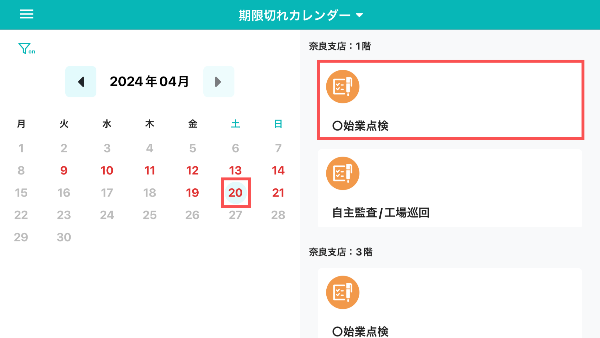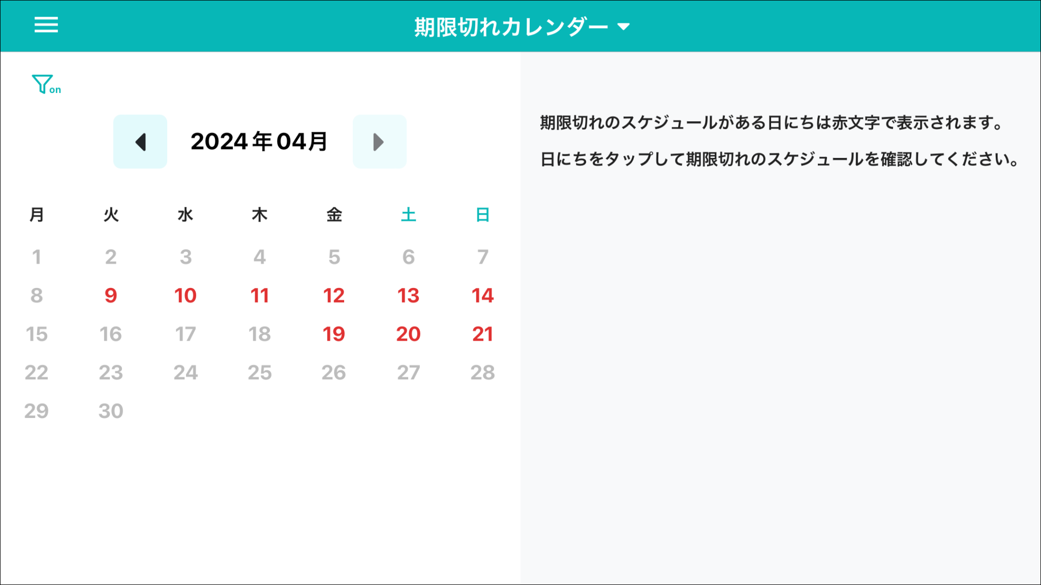 期限切れカレンダーは、「スケジュール」に紐付いて表示されています。スケジュールが設定されていないひな形での記録は反映されませんので、ご注意ください。