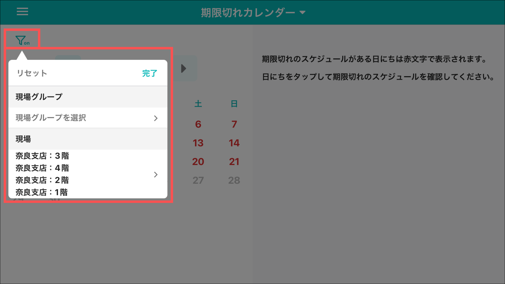 フィルターを押して、現場グループ・現場に絞って検索することができます。