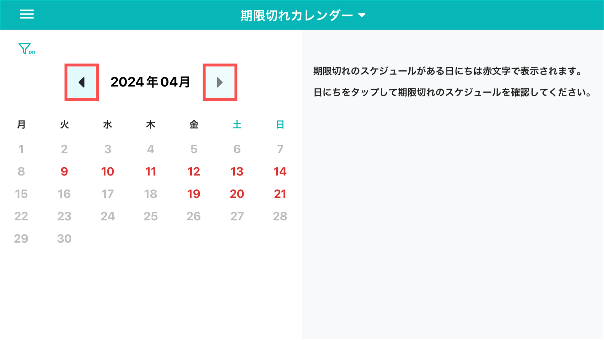 カレンダー上で、「未実施」もしくは「記録中」のスケジュールがある日が赤字で表示されます。