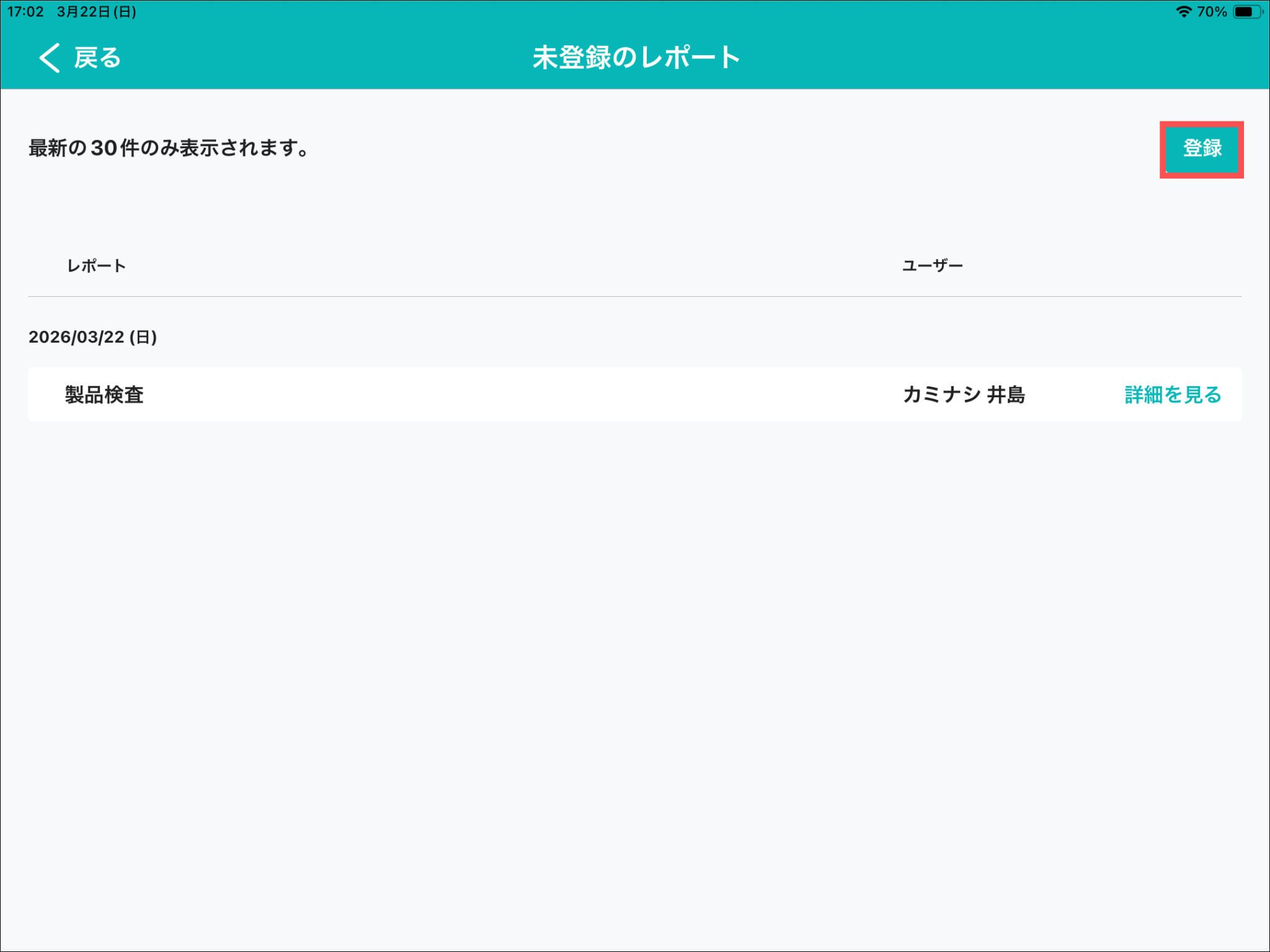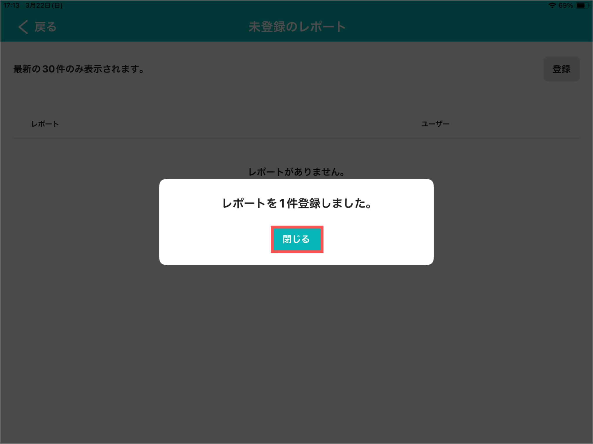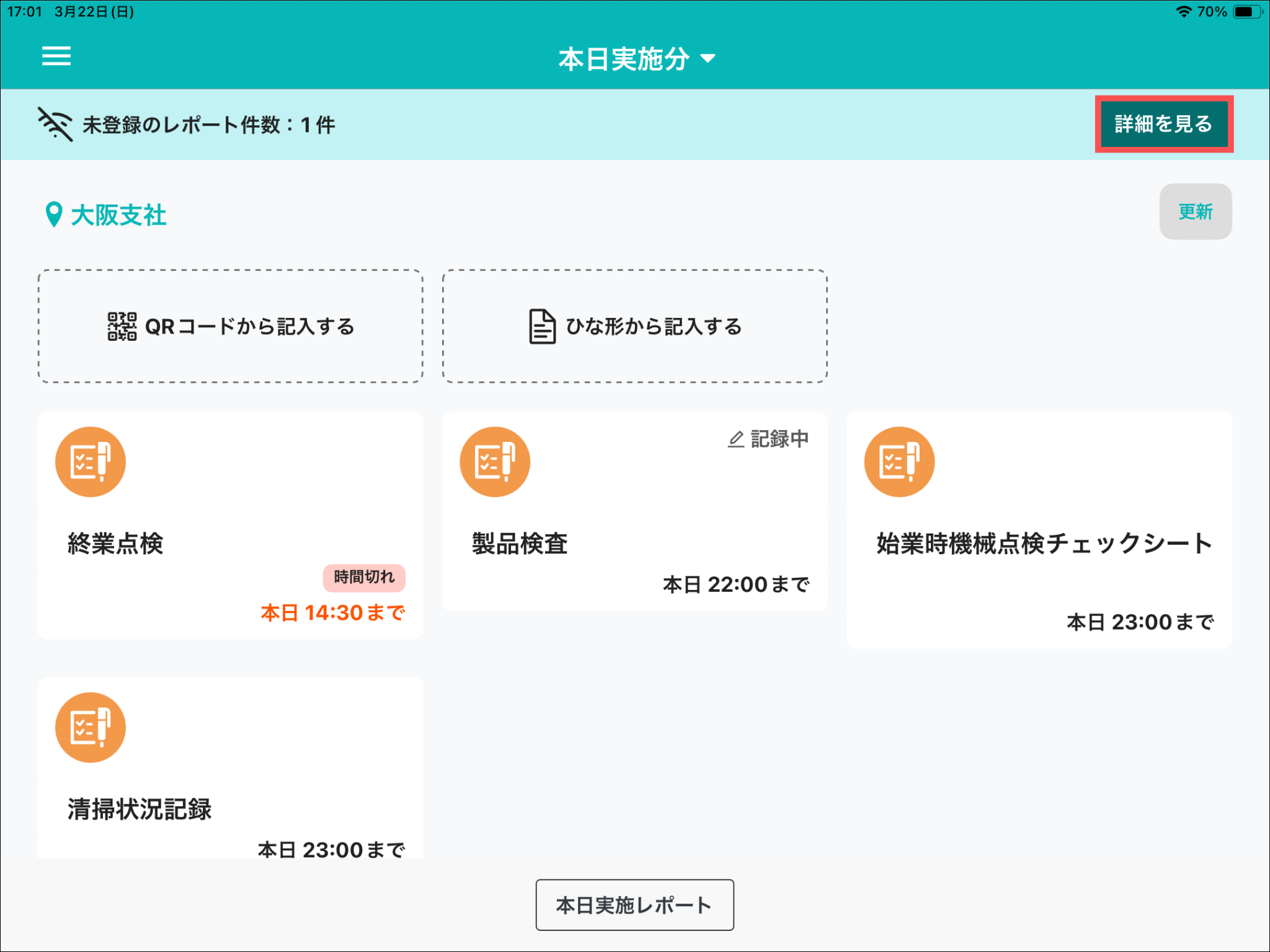 オフラインモード中にレポートを保存(一時保存・提出)した現場では、「未登録のレポート件数:◯件」と表示されます。