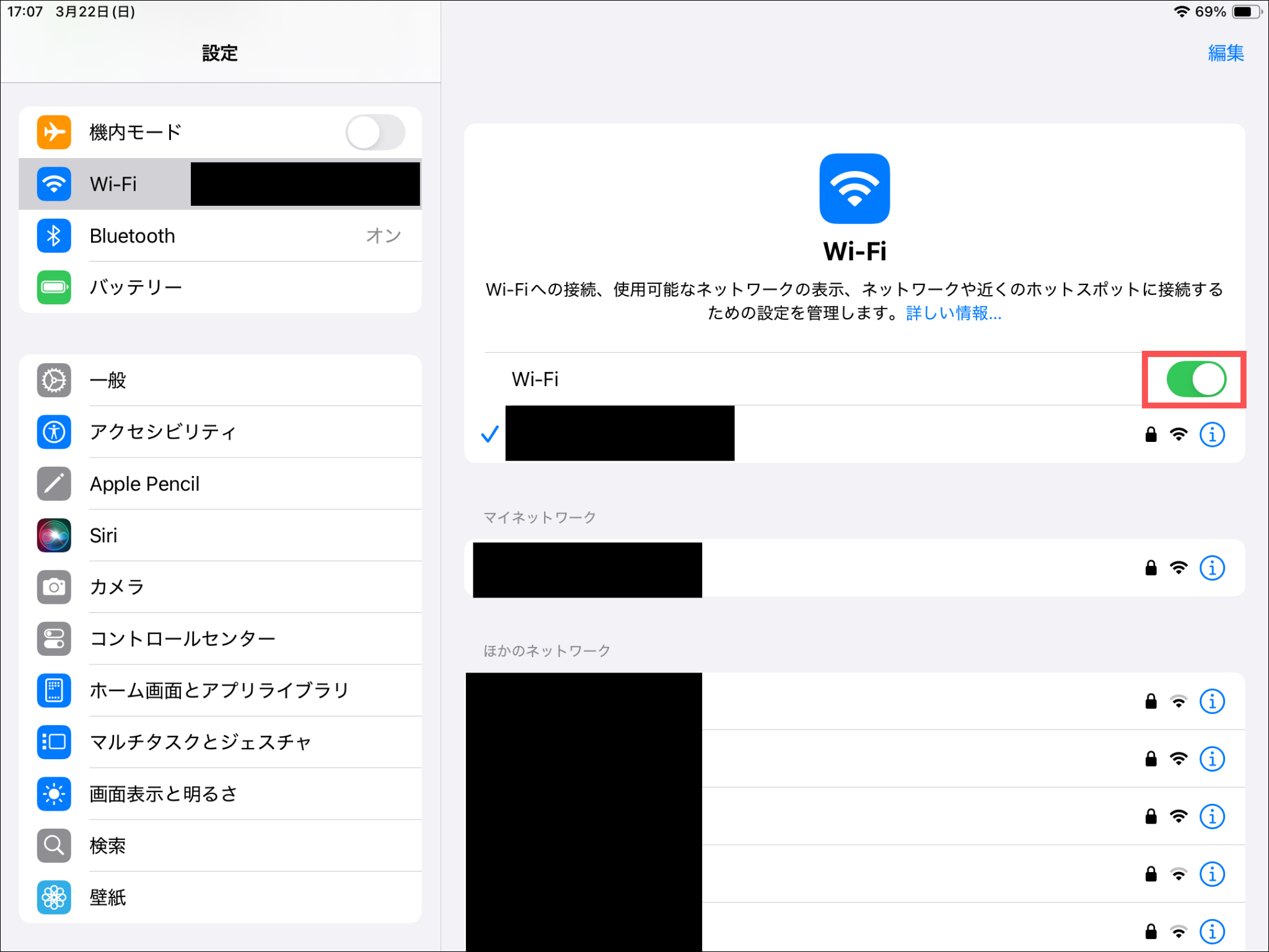 SIMカードが入っている場合: 端末の設定アプリから「機内モード」をオフにした上で、Wi-Fiもオンにします。