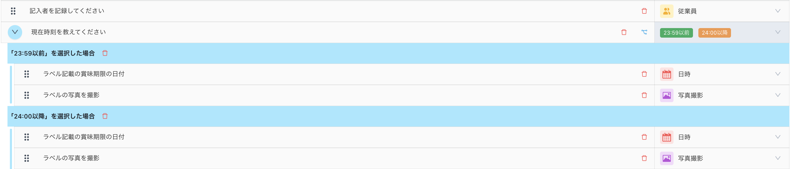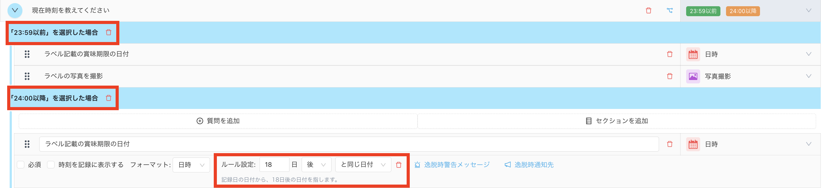 日付をまたいで賞味期限切れチェックをする場合は「23:59以前」「24:00以降」のように条件を分岐させ、それぞれでルール設定をすることで、賞味期限を確実にチェックすることが可能です。