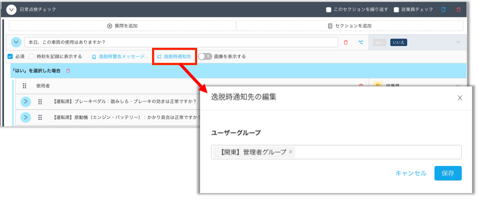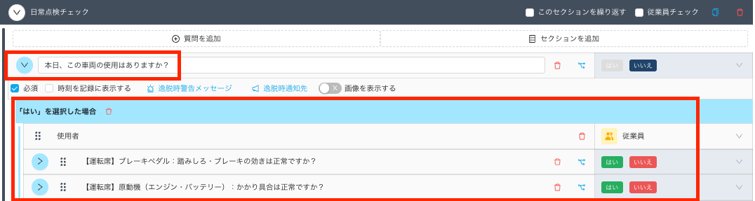 車両点検時、逸脱した項目についてのみ「写真撮影」や「運行管理者へ連絡」といった次の行動を指示する質問を出します