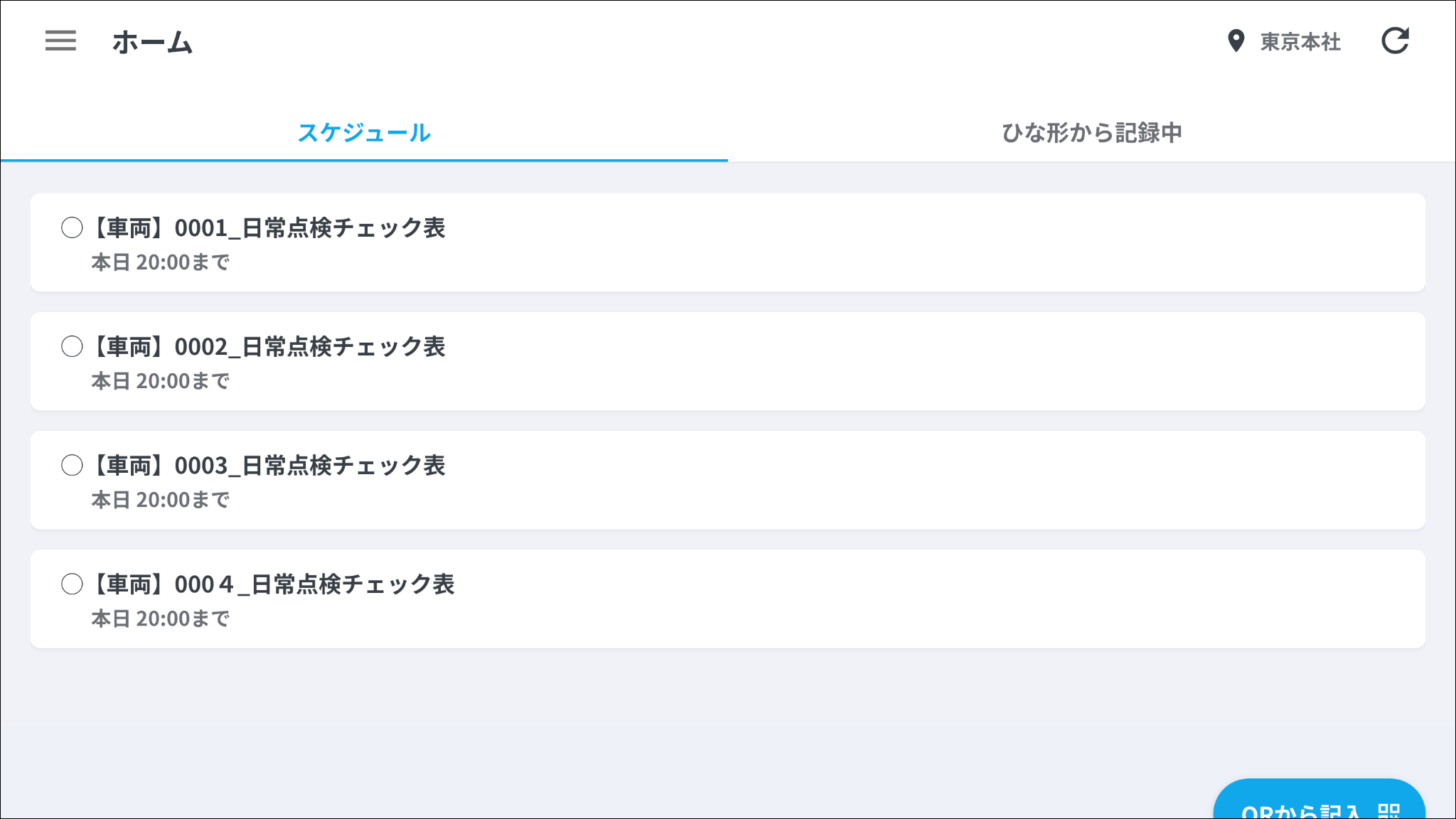 記録者の画面からは、車両名のついたスケジュールが表示されるため、今日担当する車両のみ記録を行い、運行がない車両は「本日の運行有無」を確認する質問を最初に入れて条件分岐を使って必要な質問だけに回答していきます。