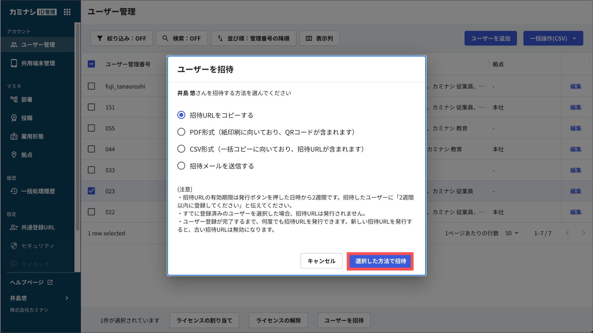 • 特徴:1名のみ選択されている場合、直接招待URLをコピーできます。それを用いて初期設定を行います。