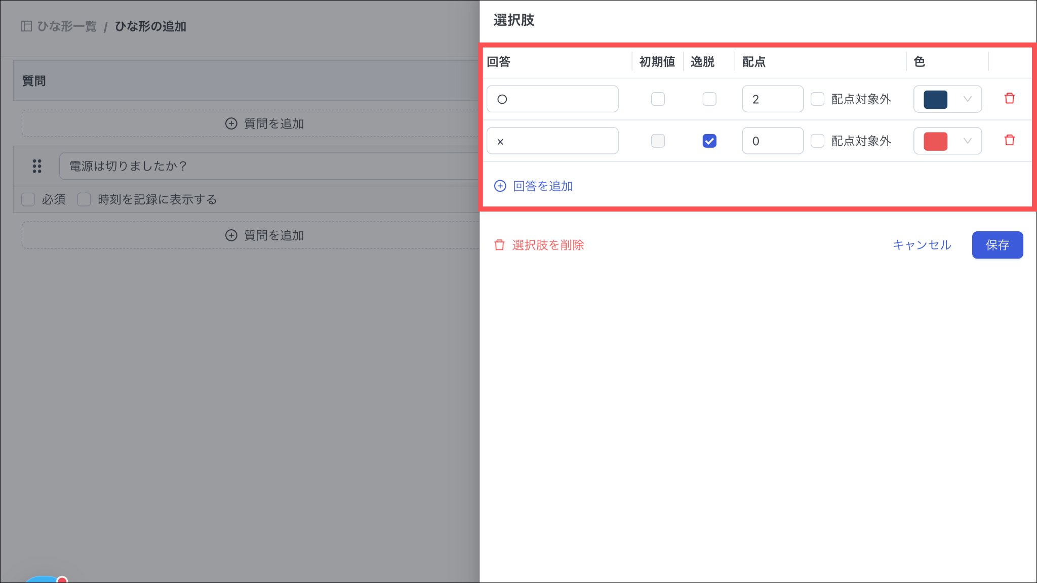 逸脱:選択した回答を逸脱にし、アラートを表示させる場合、チェックを入れる