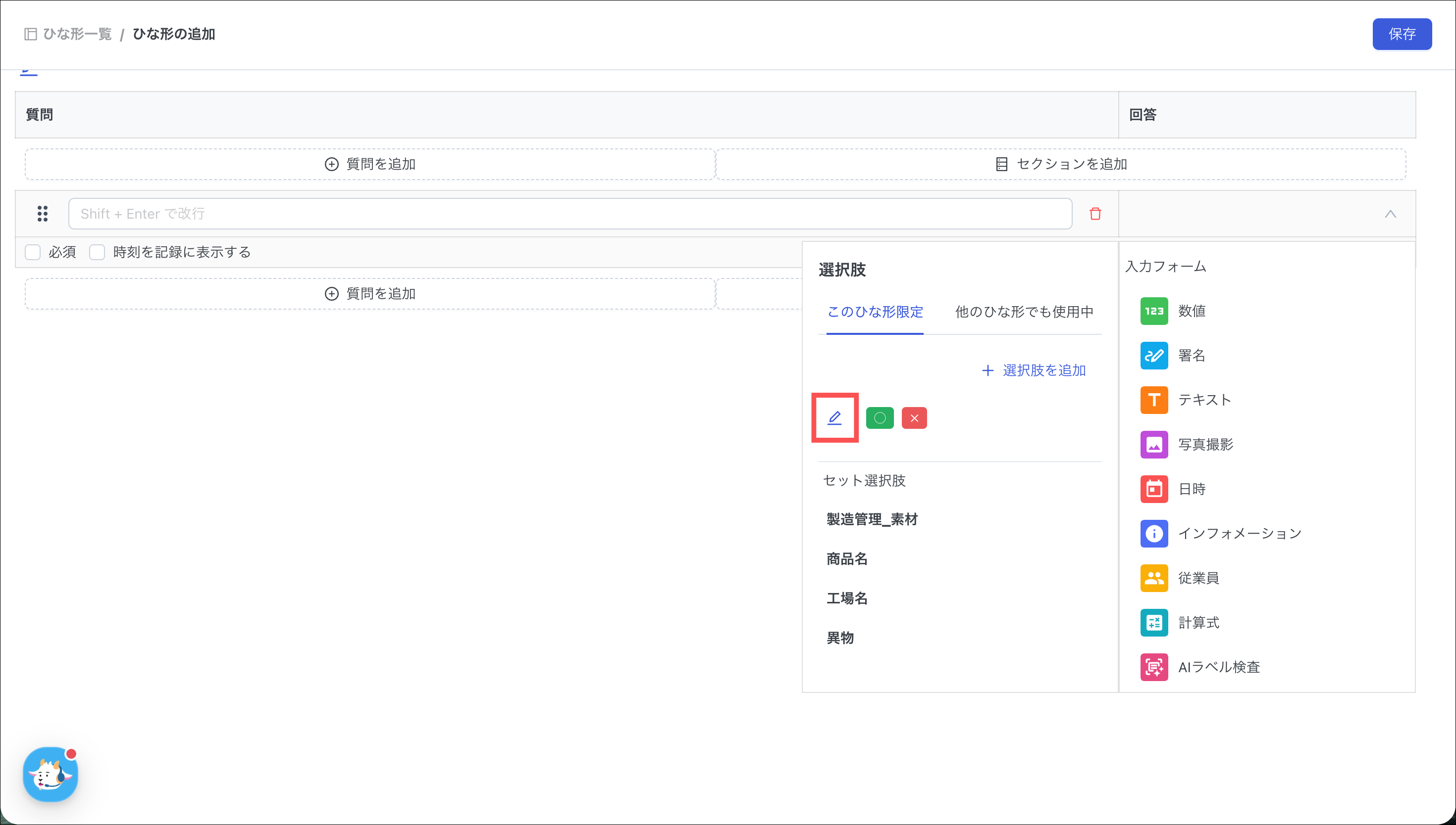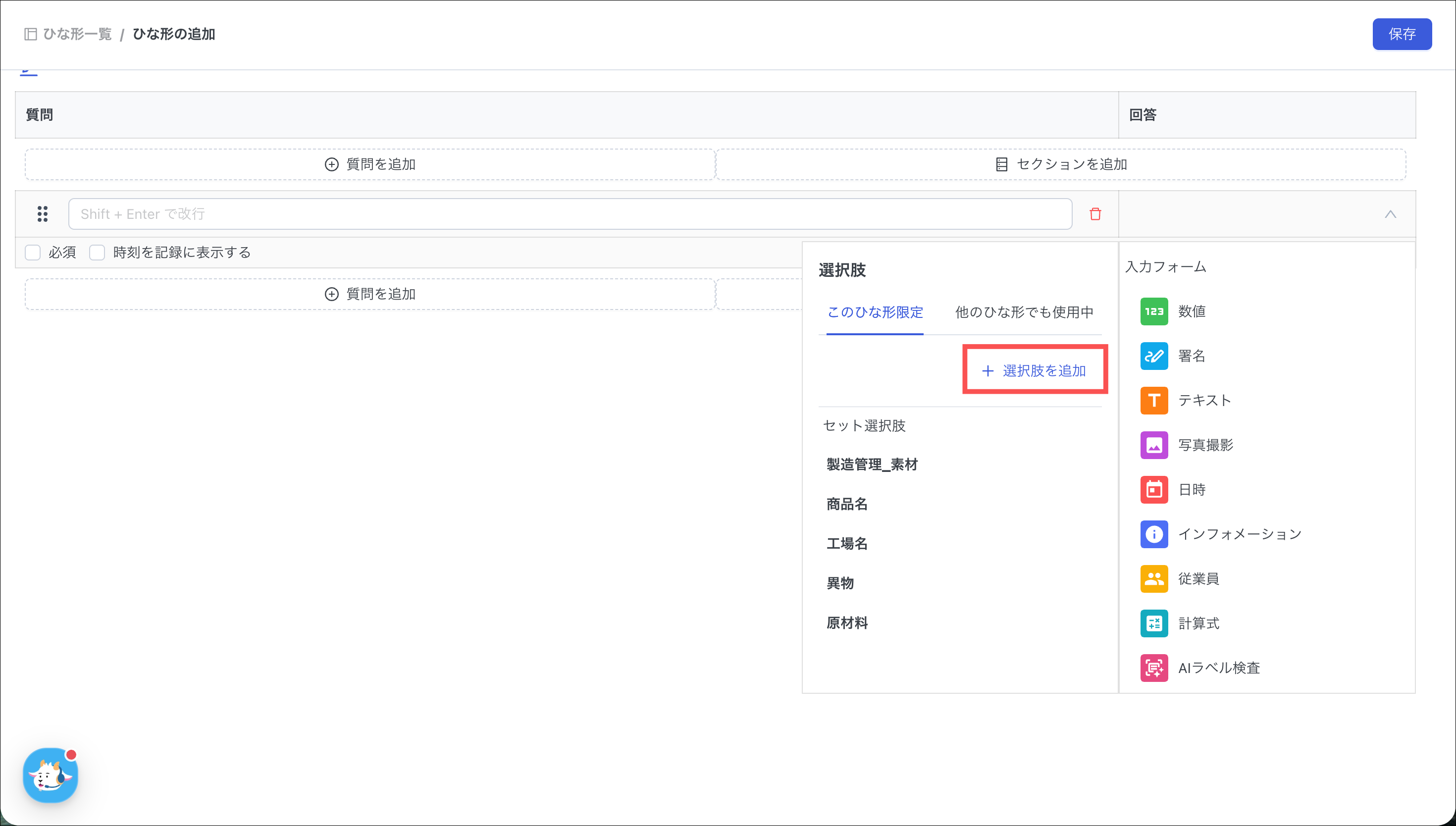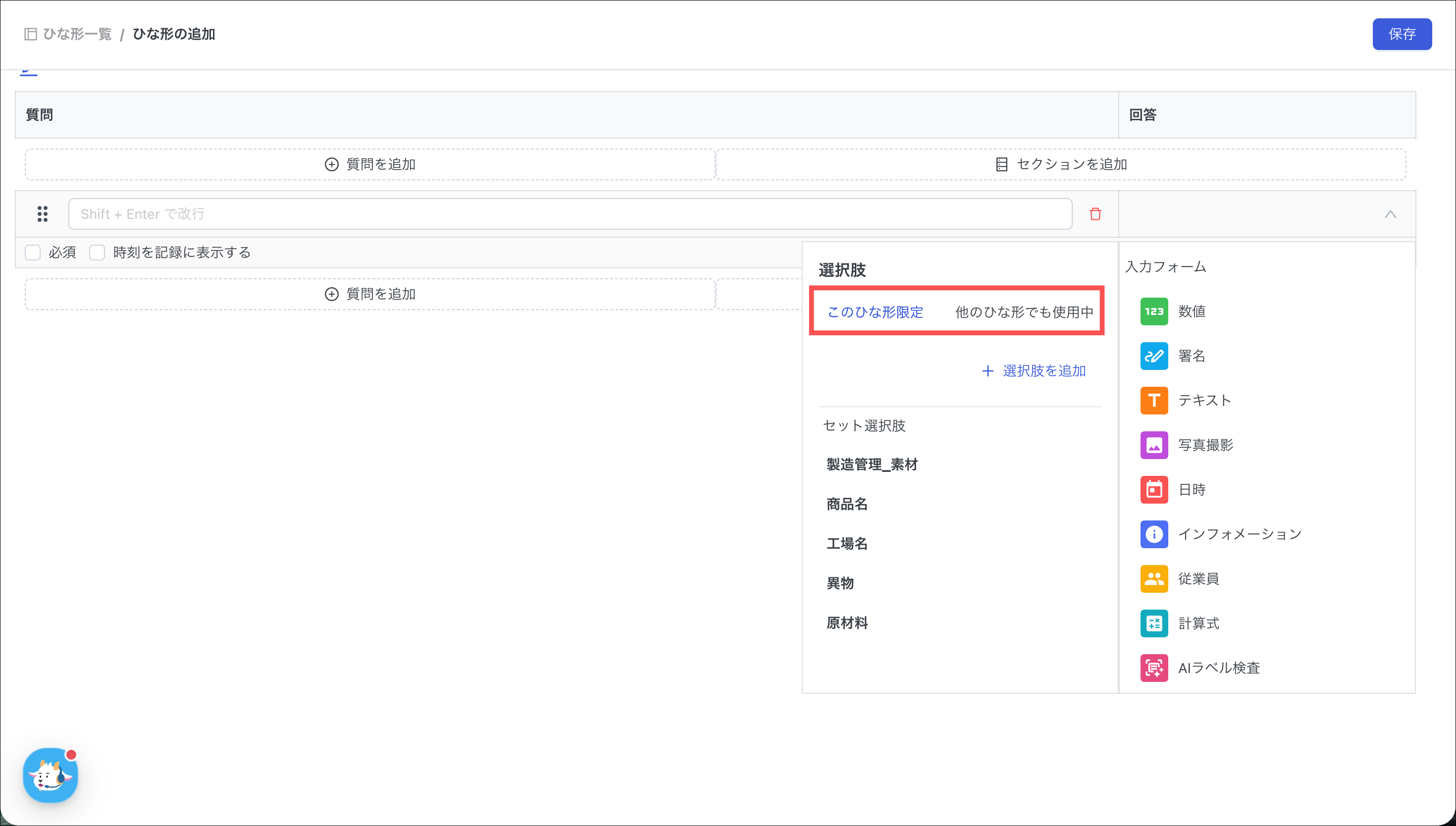 ・このひな形限定:作成した選択肢が、現在編集中のひな形での利用に限定できます。