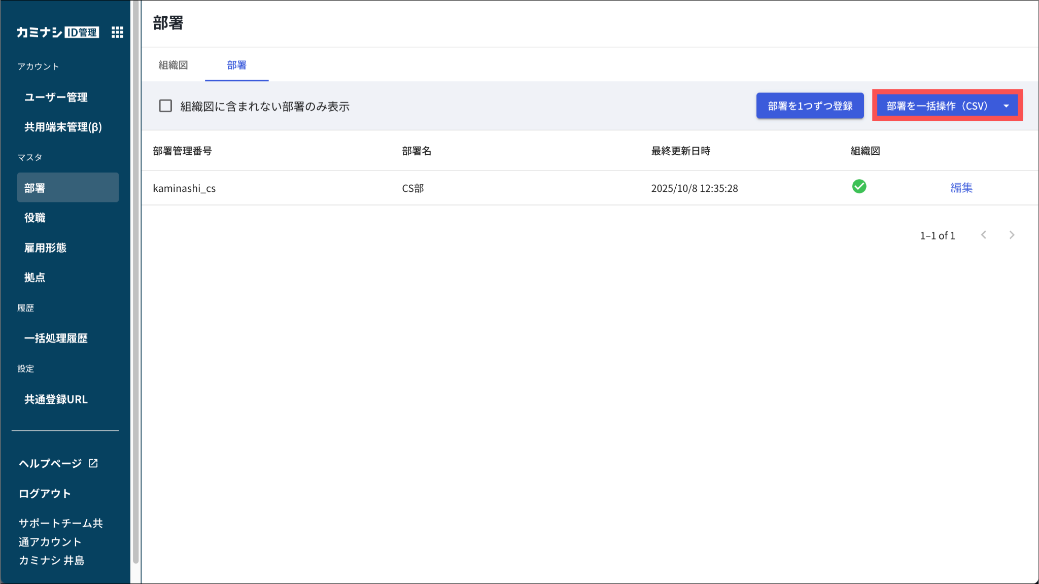 CSVファイルを使った一括編集では、部署管理番号を一括で更新することはできません。