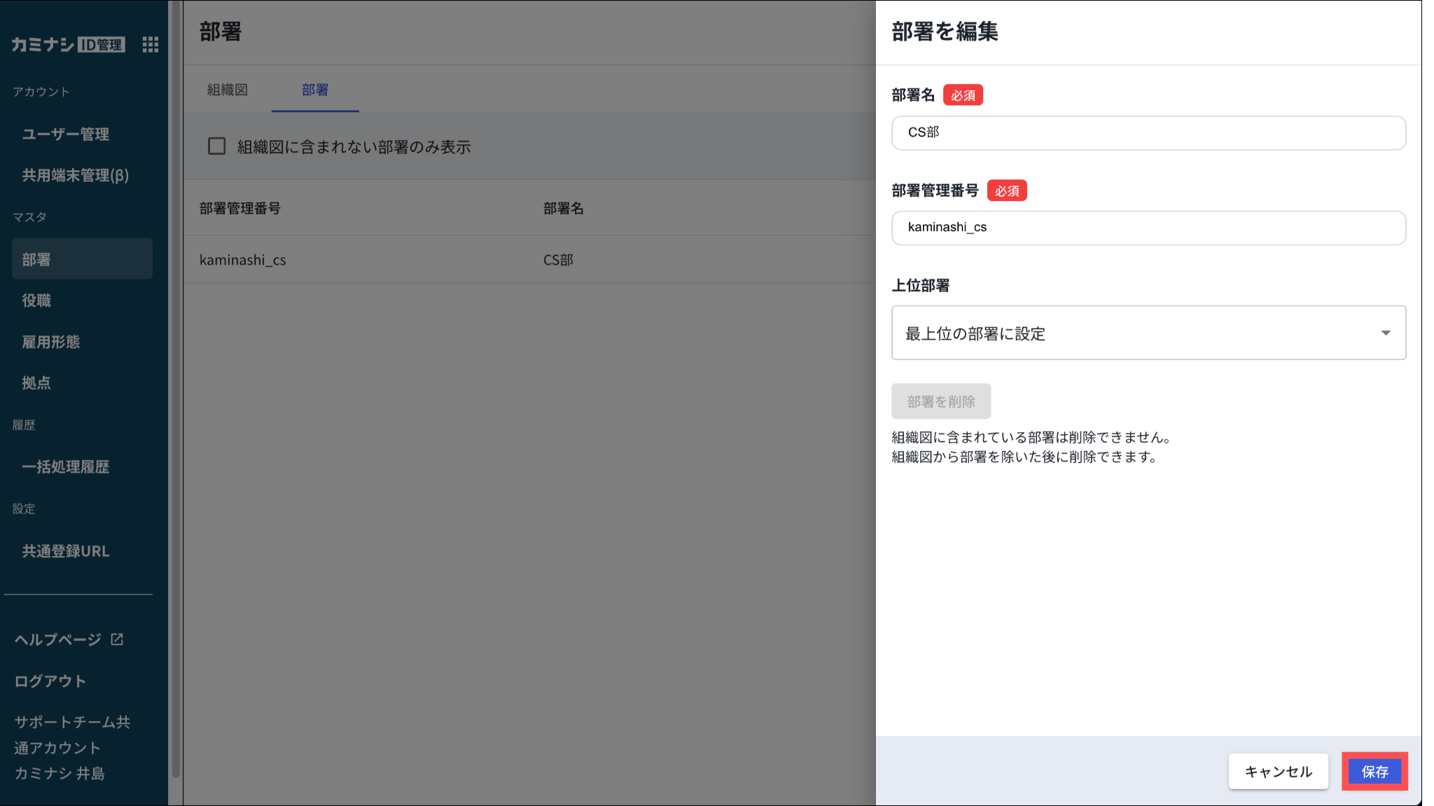 編集例として「部署」を編集するときの画像を用いています。「役職」や「雇用形態」、「拠点」でも手順は同じとなります。
