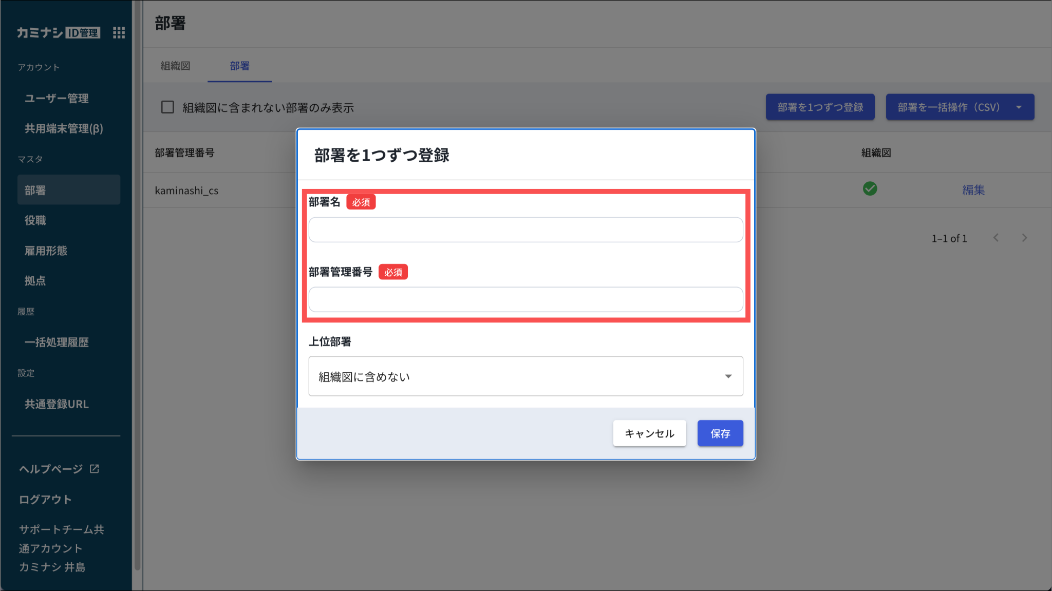 特定の部署の下に置く場合は、親となる部署名を一覧から選択してください。