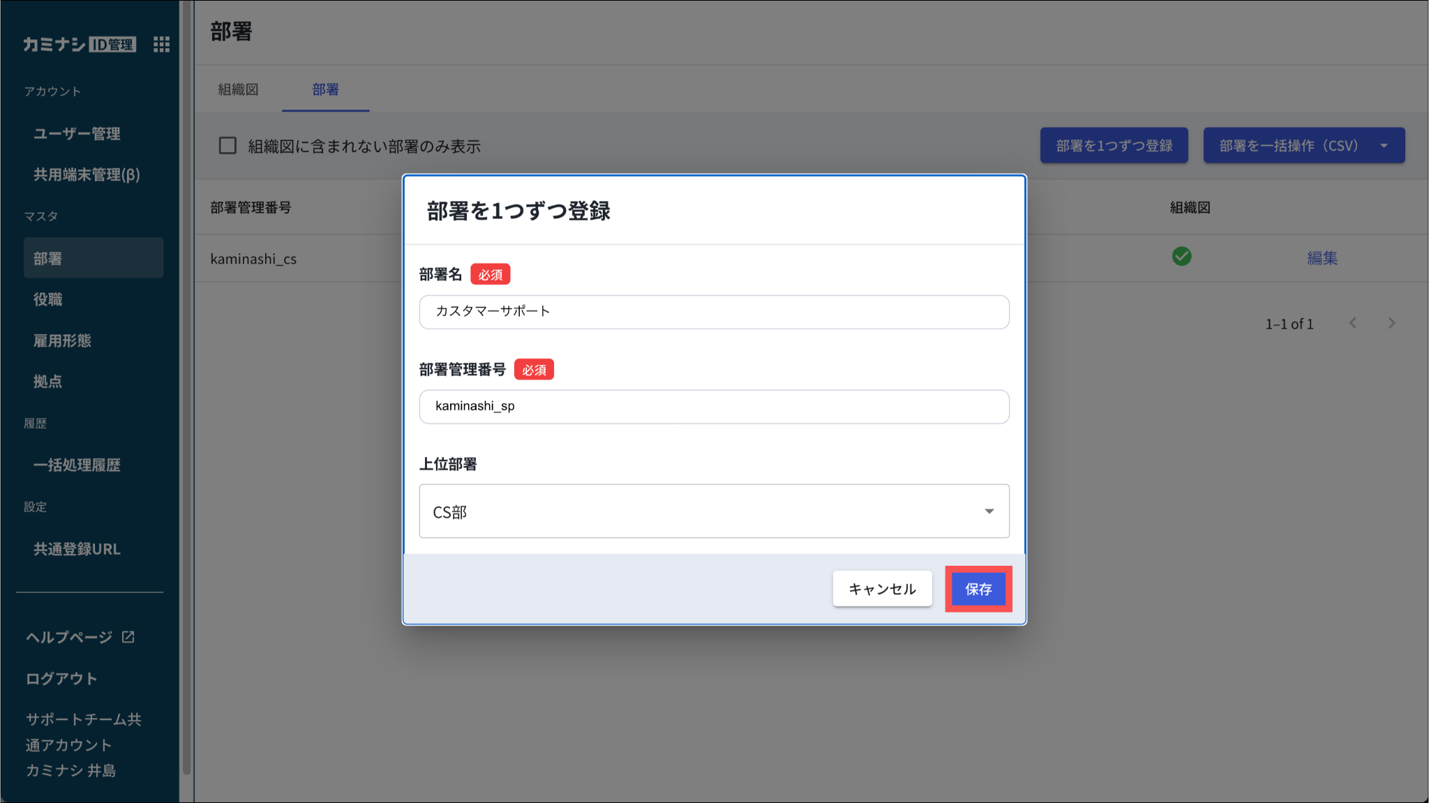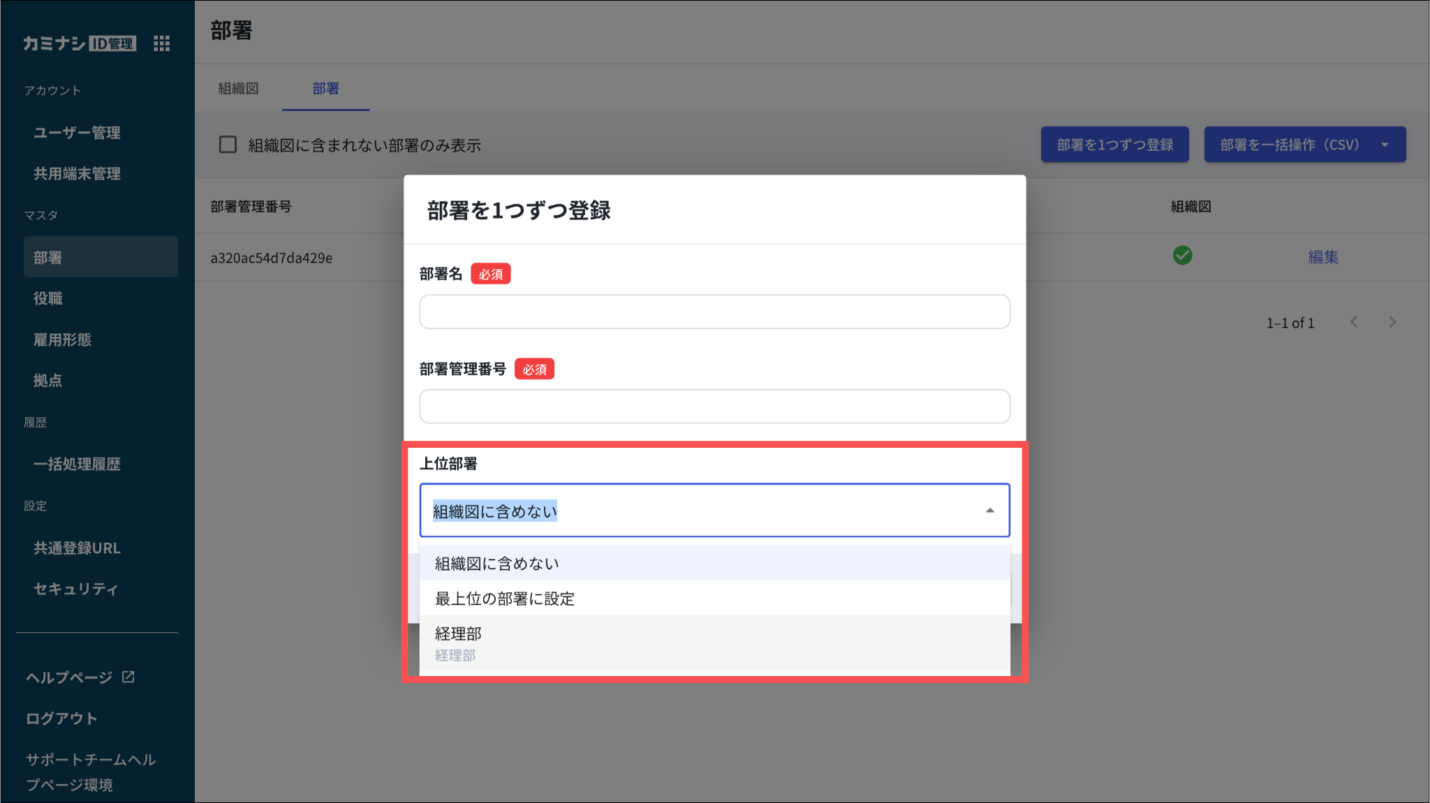 登録する部署を、組織図のどの部署の下に配置するかを選択します。