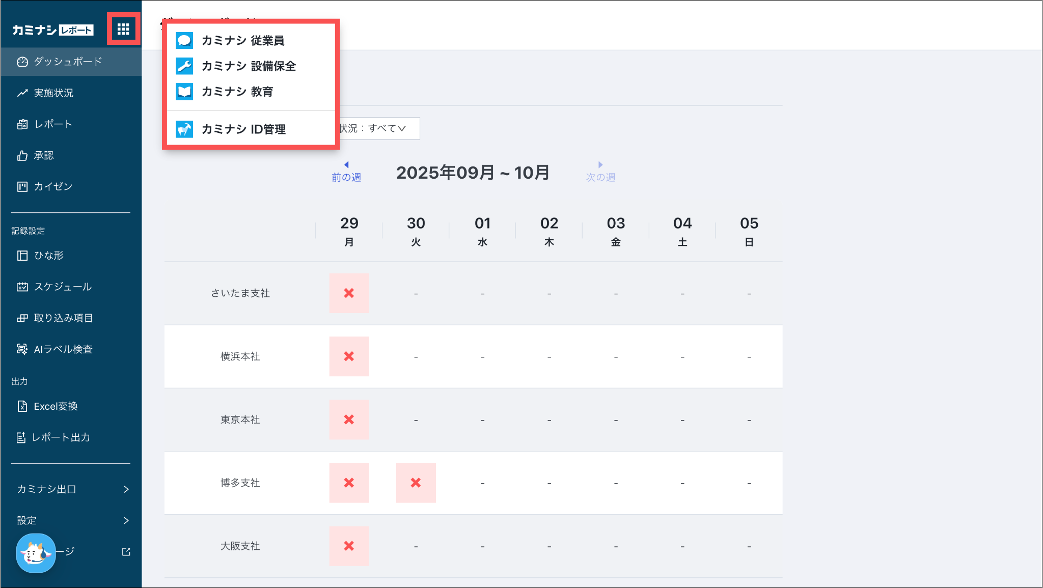 これまでカミナシレポート管理画面では、左メニューに他サービスへアクセスするための導線がありませんでした。