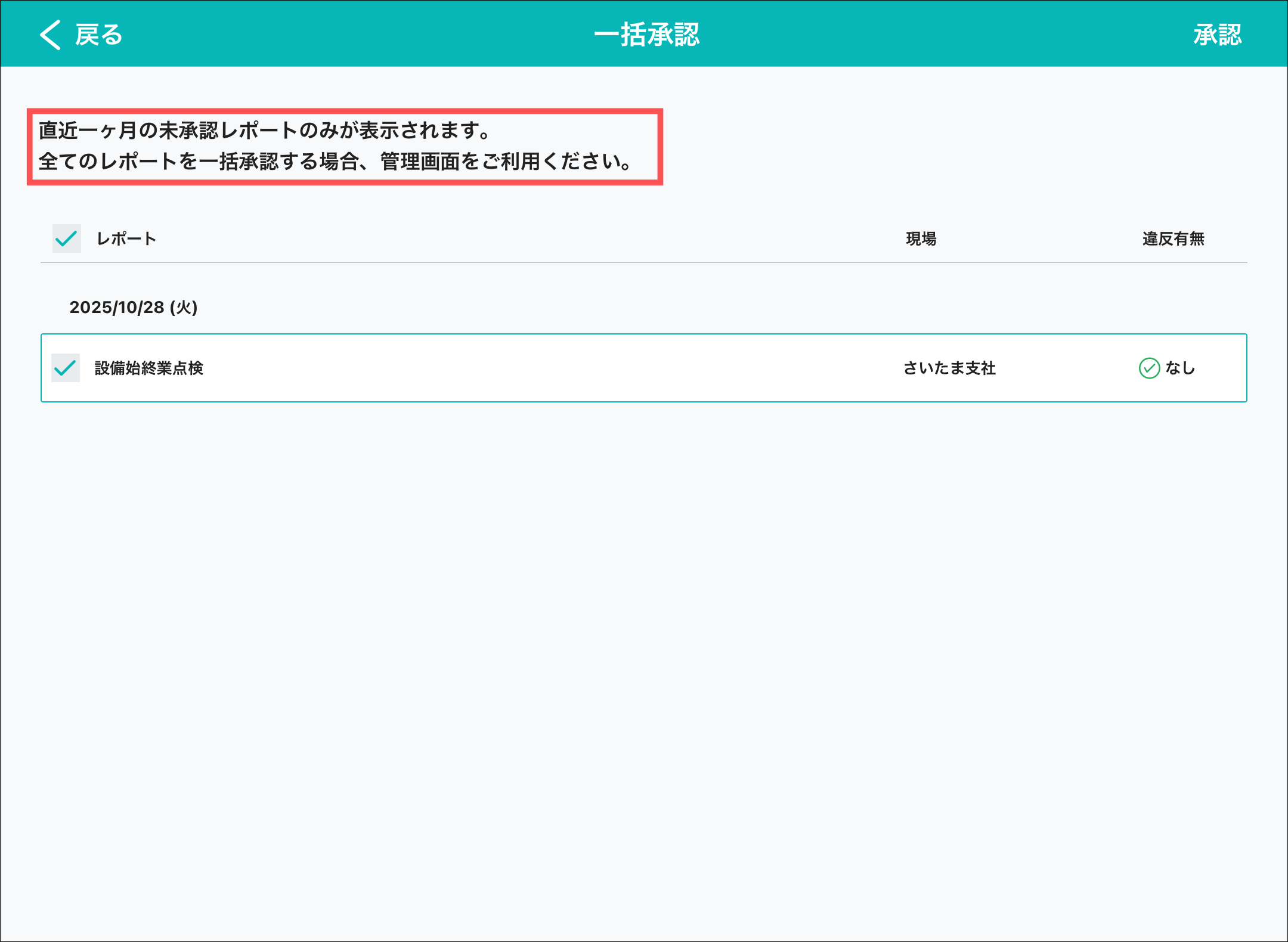 ・直近1ヶ月以前の未承認レポートを一括承認する場合は、管理画面の「承認」画面から行う必要がございます