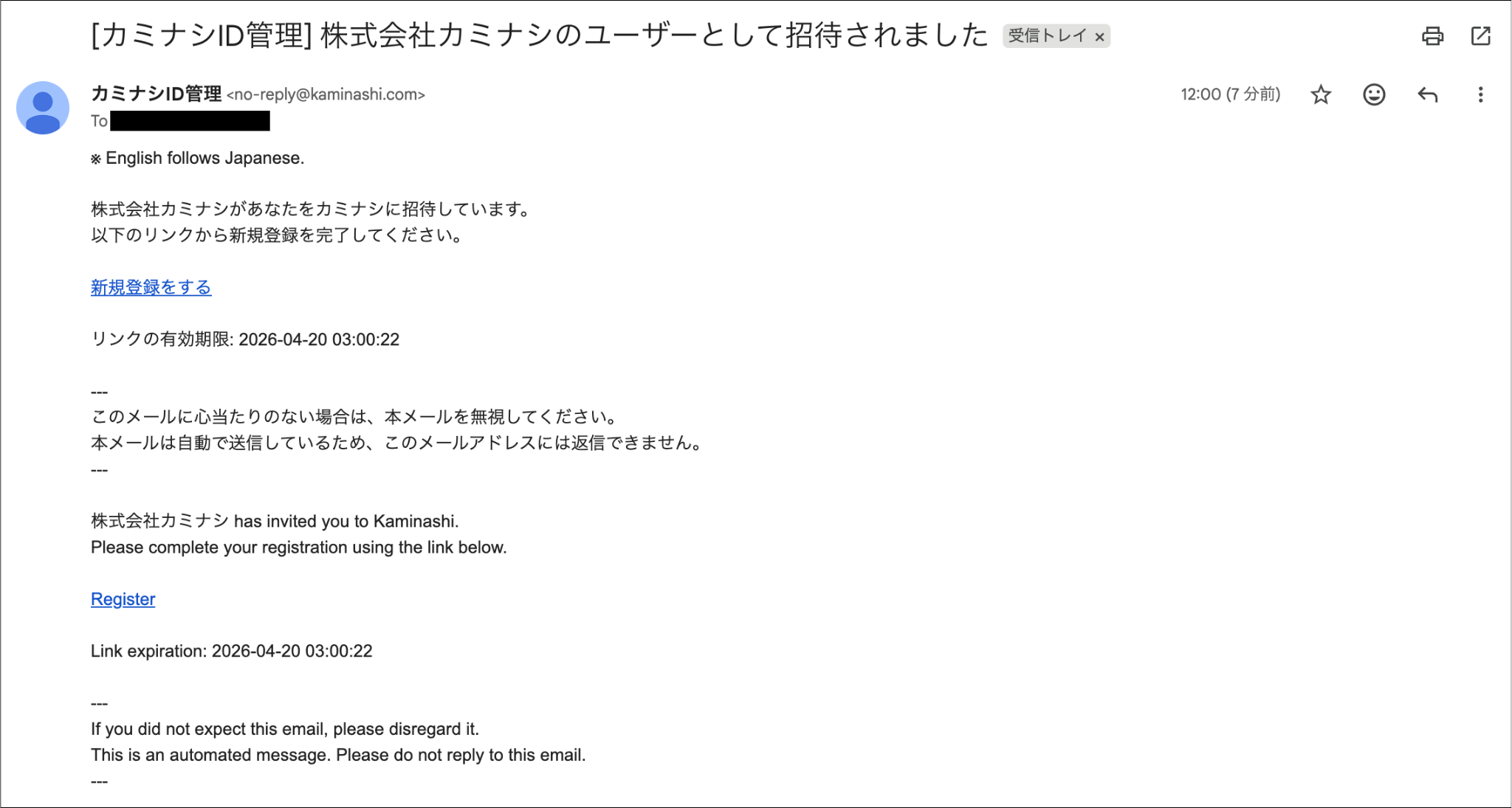 今回のリリースにより、カミナシID管理から登録されたメールアドレス宛に招待メールを自動で送信できるようになりました。