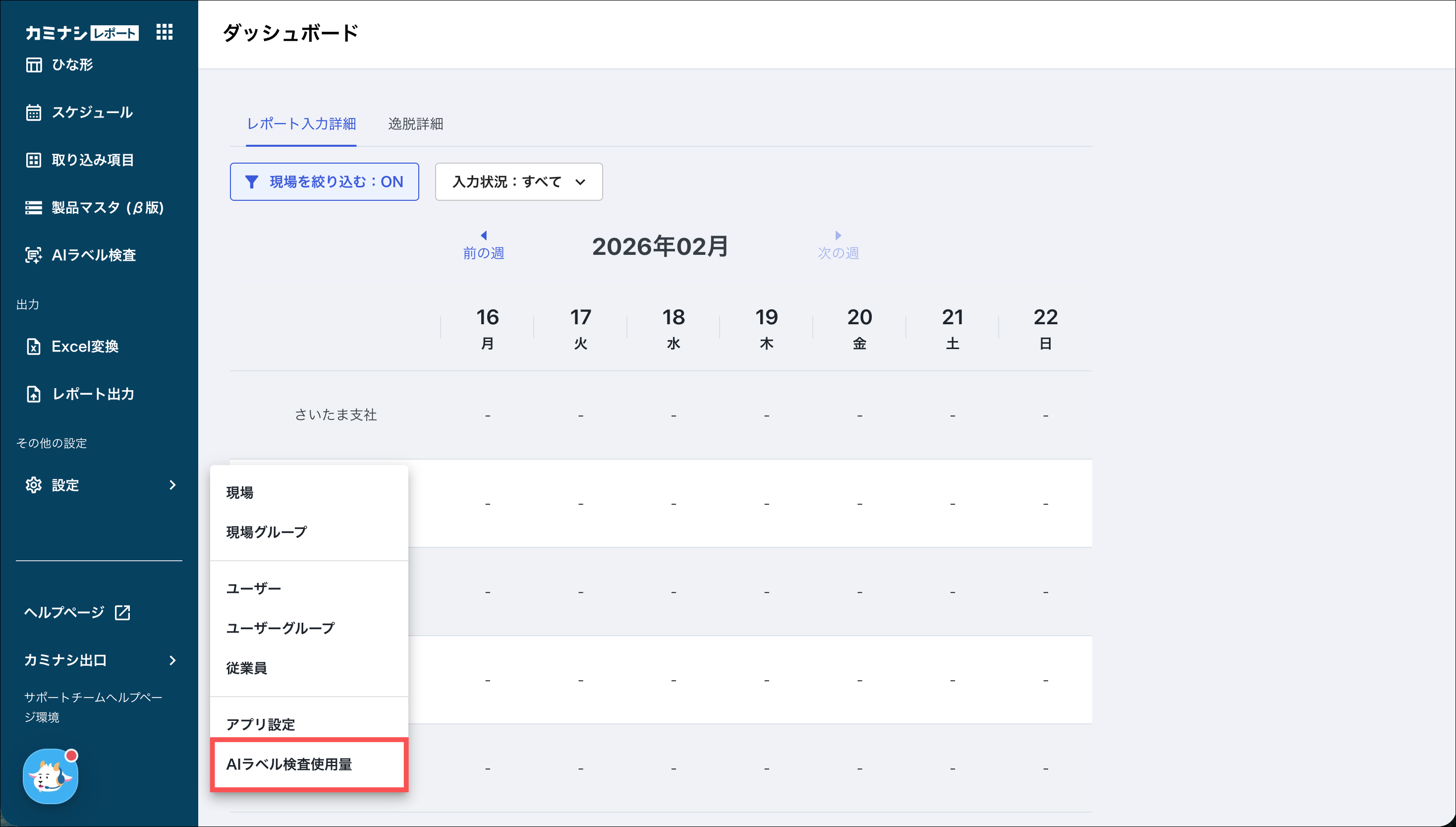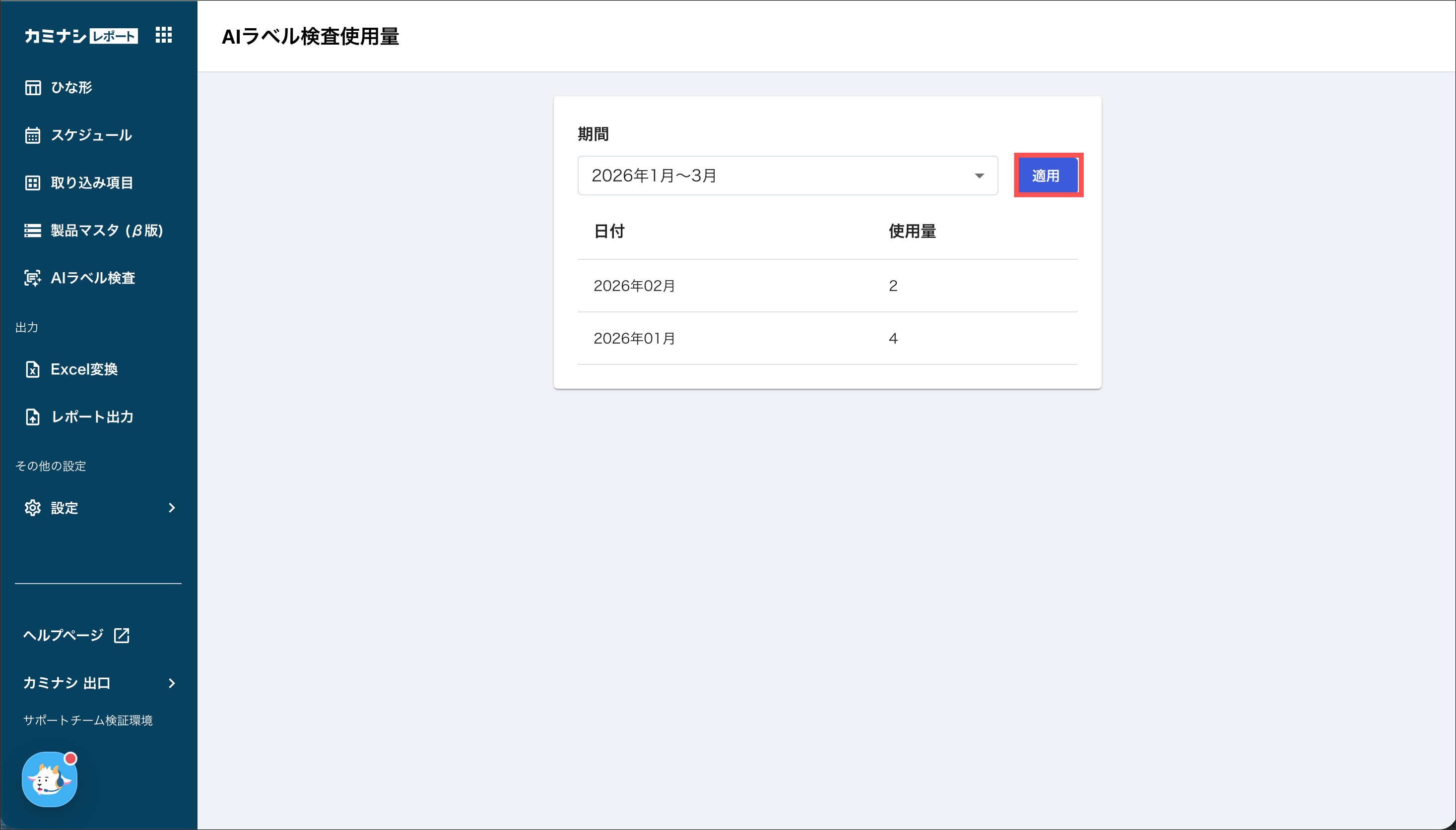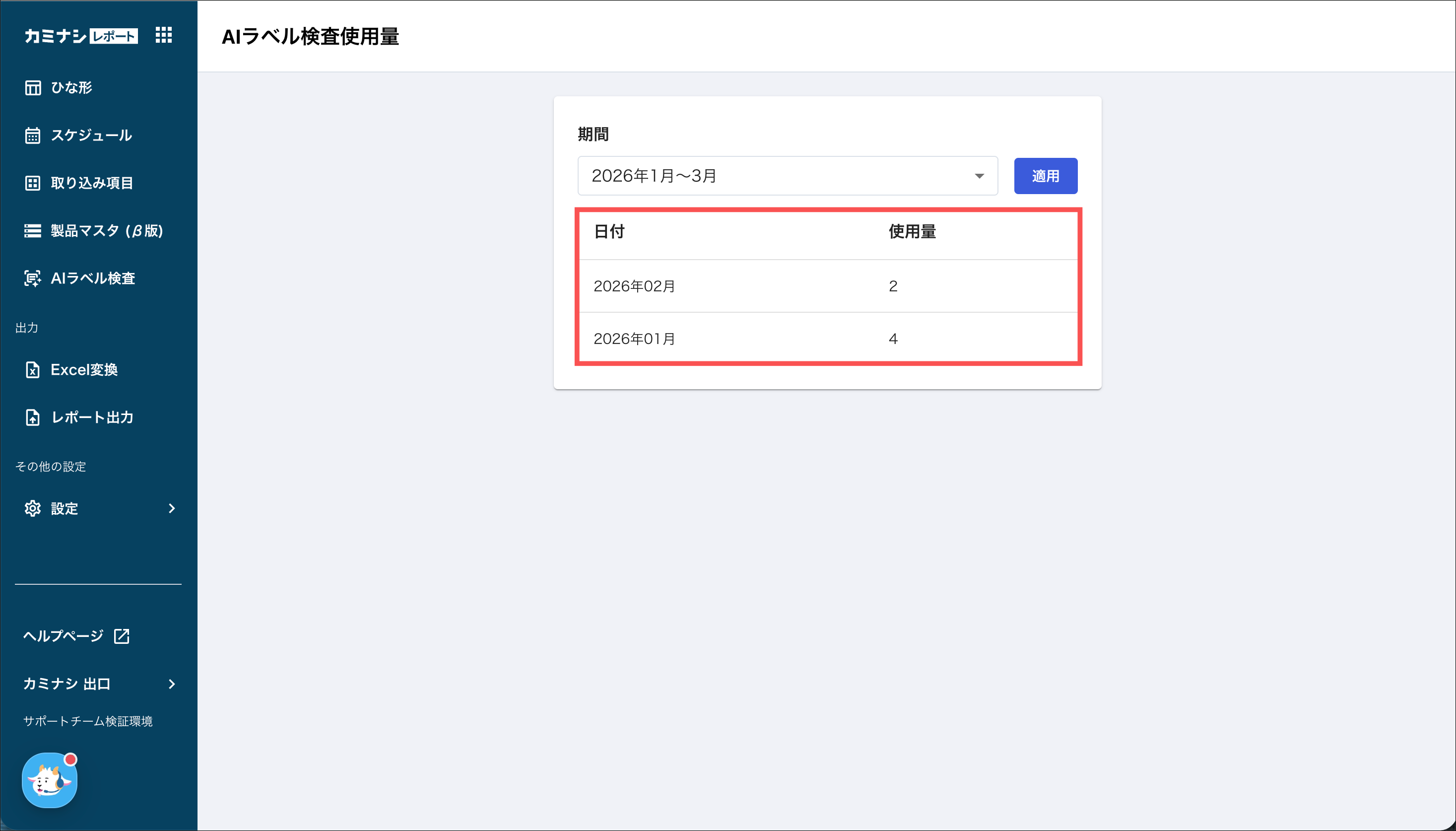 1.カミナシレポート 管理画面にログインする2.「設定」を押し、「AIラベル検査使用量」を選択する3.期間を選択し、「適用」を押す4.AIラベル検査使用量を確認するAIラベル検査の使用量は、以下の計算式によって算出されます。使用量 = ラベルマスタ数 × 提出されたレポート数よくある質問は、こちらからご確認ください。
