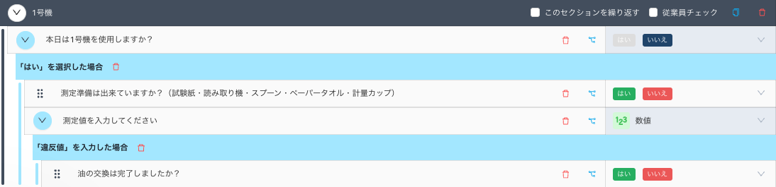 機材を使わない日もあるかとおもいます。そういった日には測定をしないようであれば、最初の質問で「使用しますか」という質問を設置しましょう。