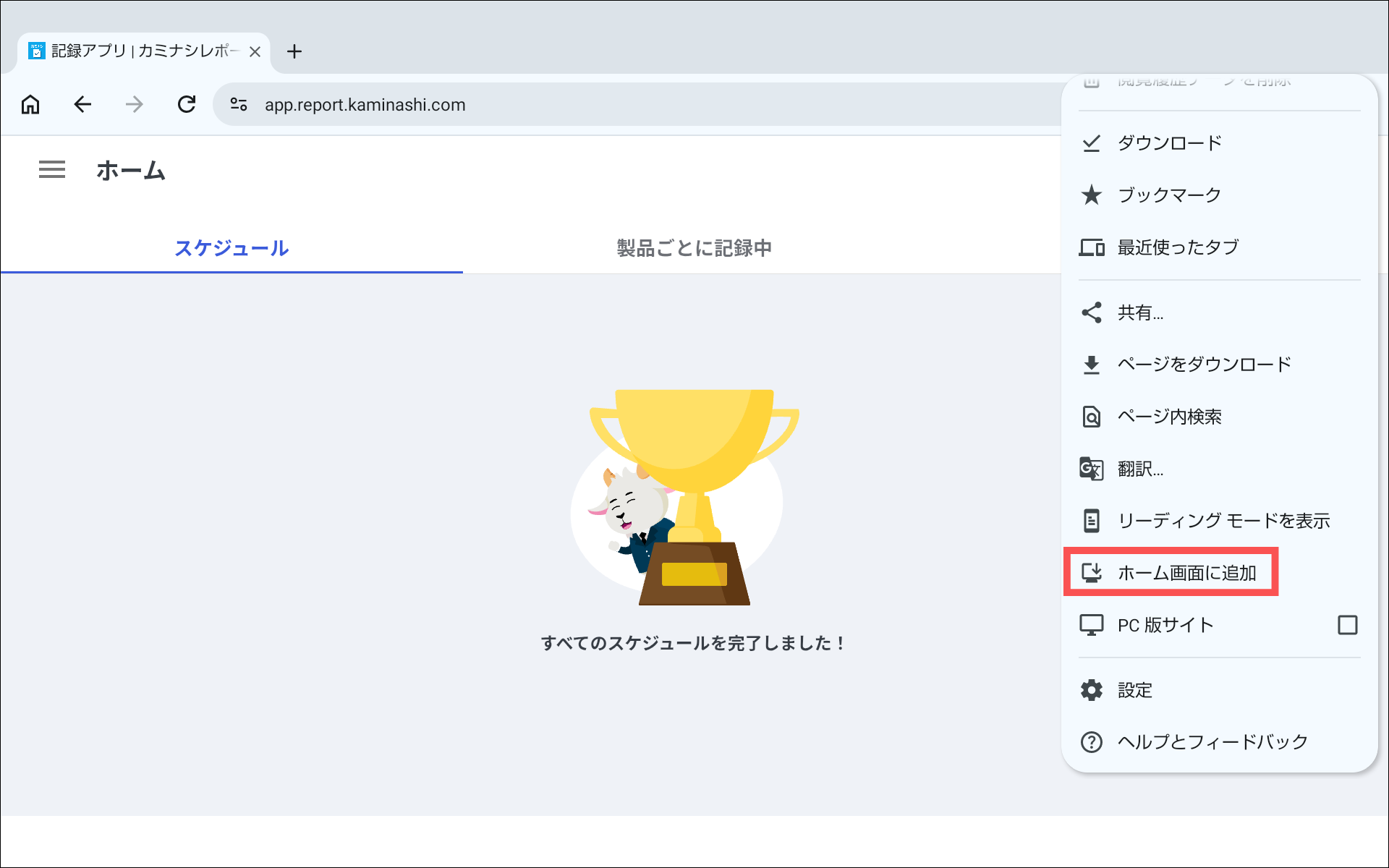「ホーム画面に追加」が表示されない場合は、お使いの環境がサポート対象か、シークレットモードで開いていないかご確認ください。