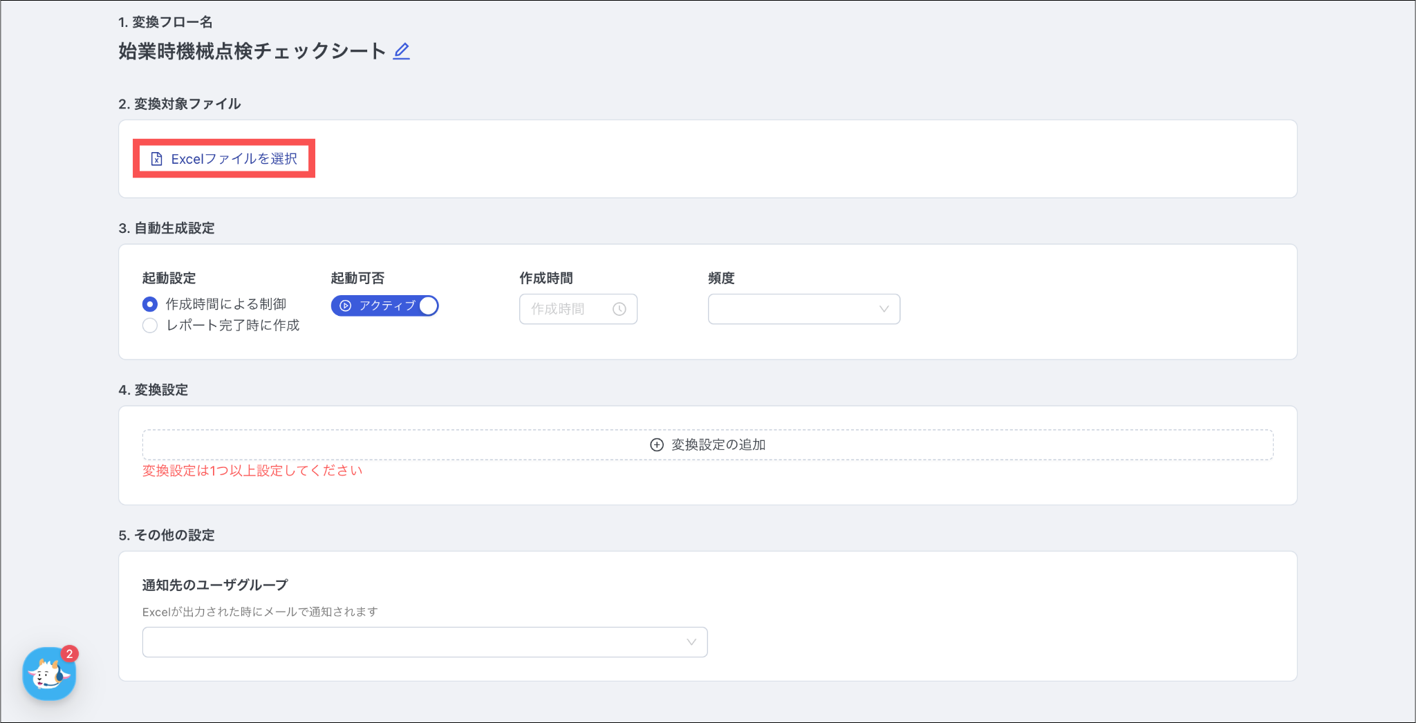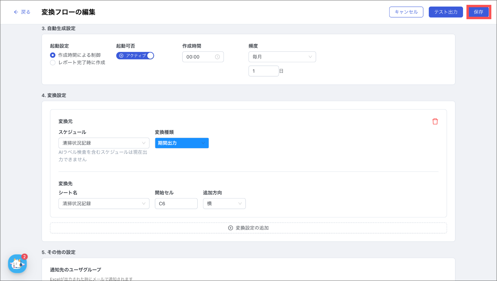 変換設定の詳細は、「Excel変換フローを作成する:11.データ出力するスケジュールを選択する」をご参照ください。