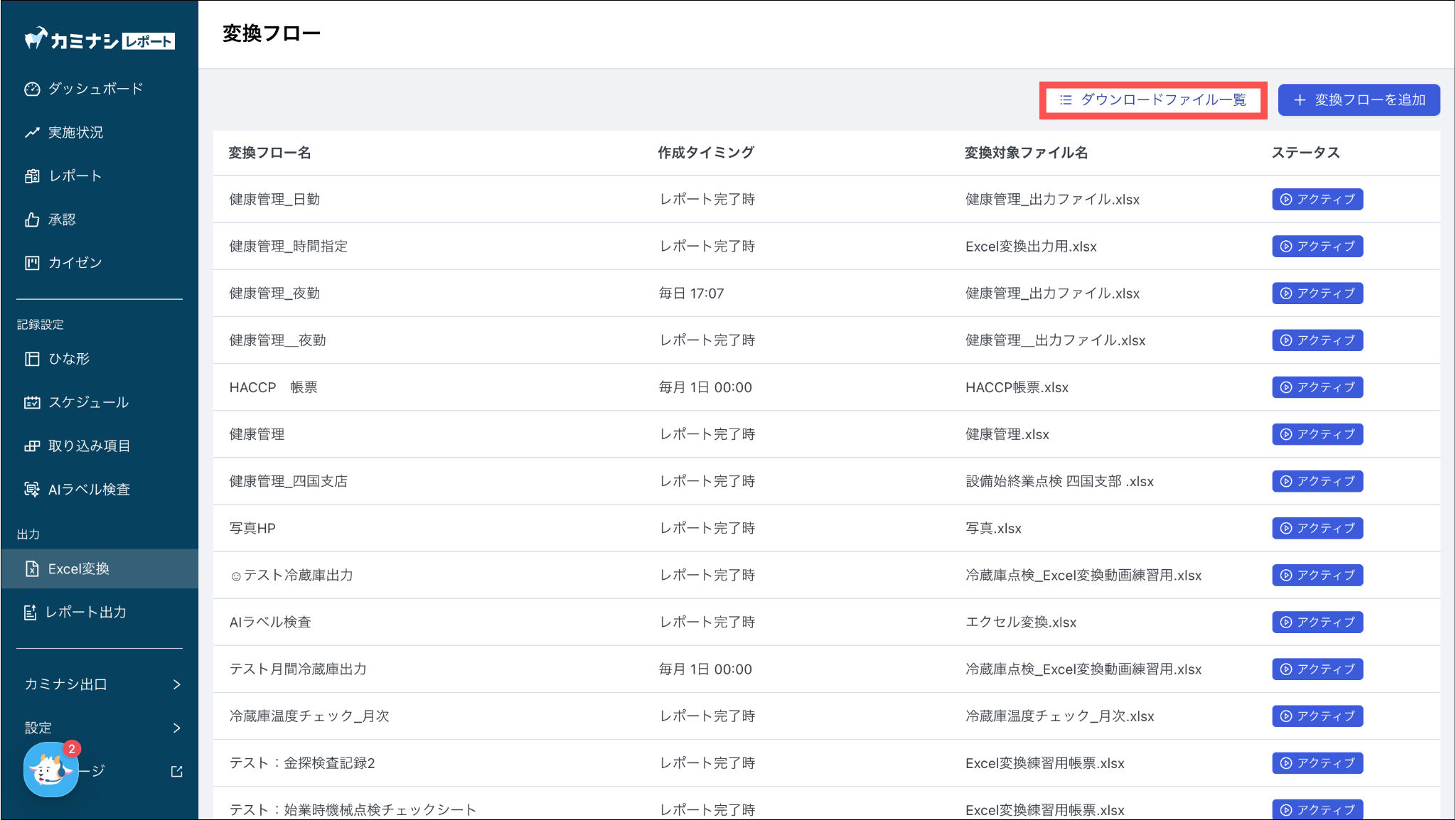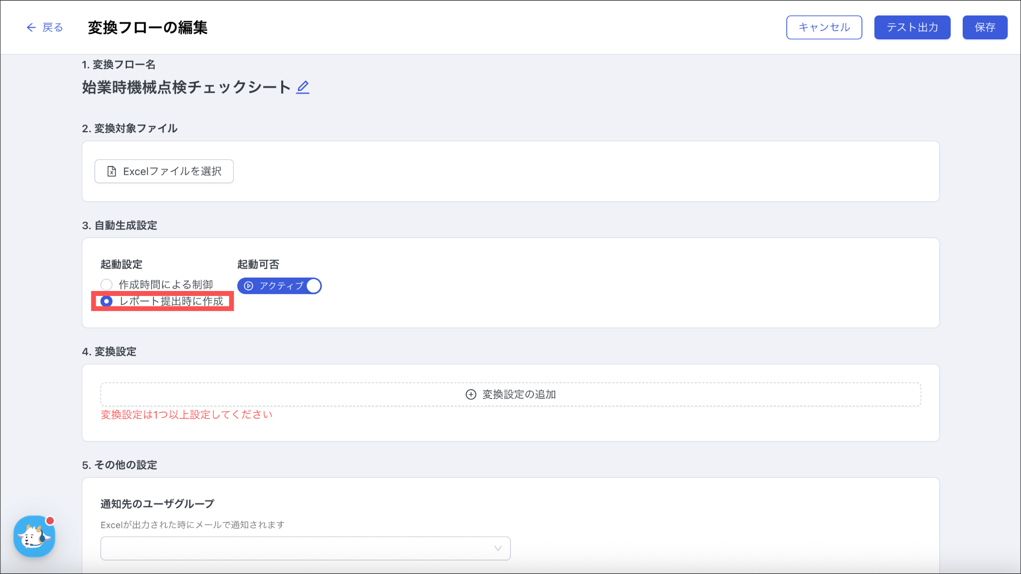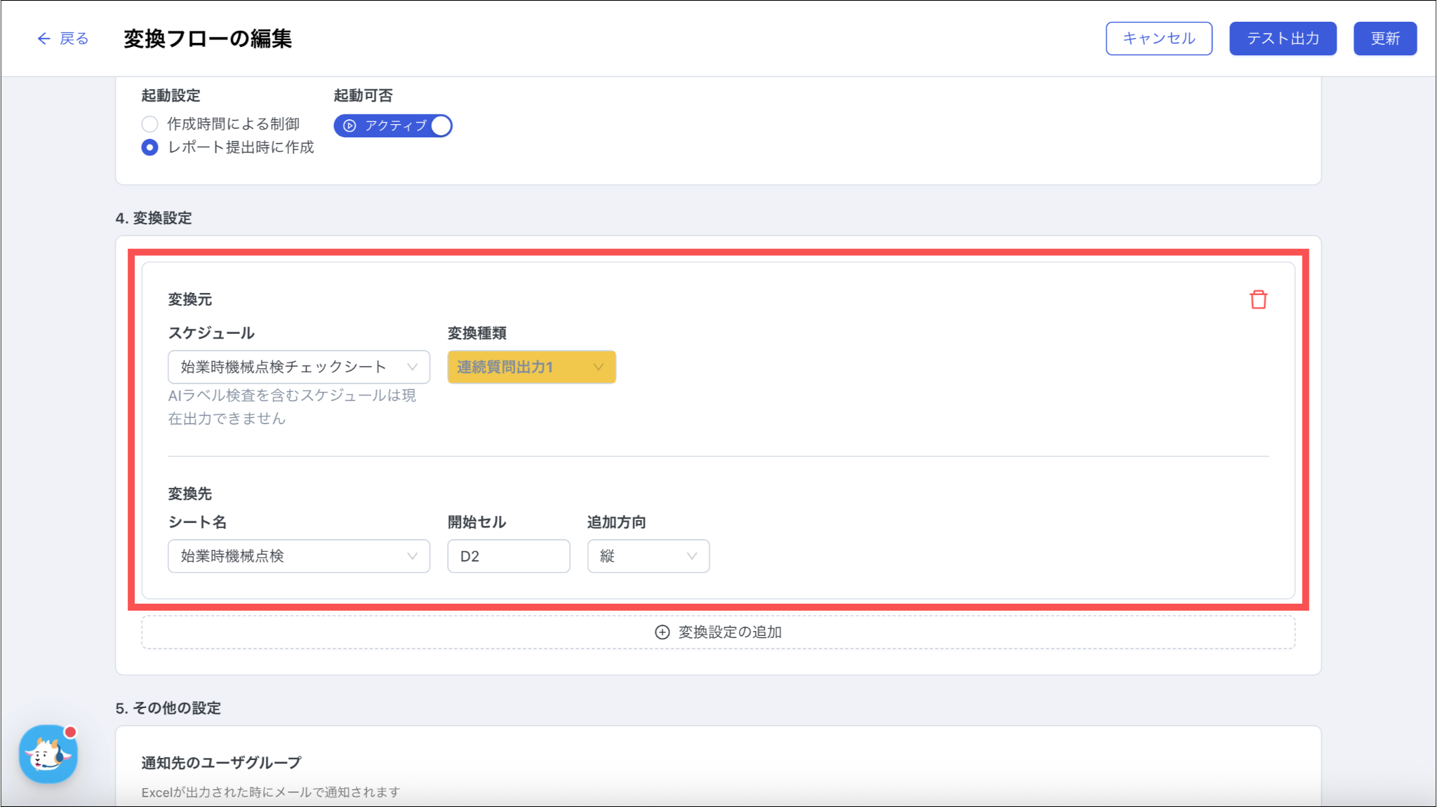 変換設定の詳細は、「Excel変換フローを作成する:11.データ出力するスケジュールを選択する」をご参照ください。