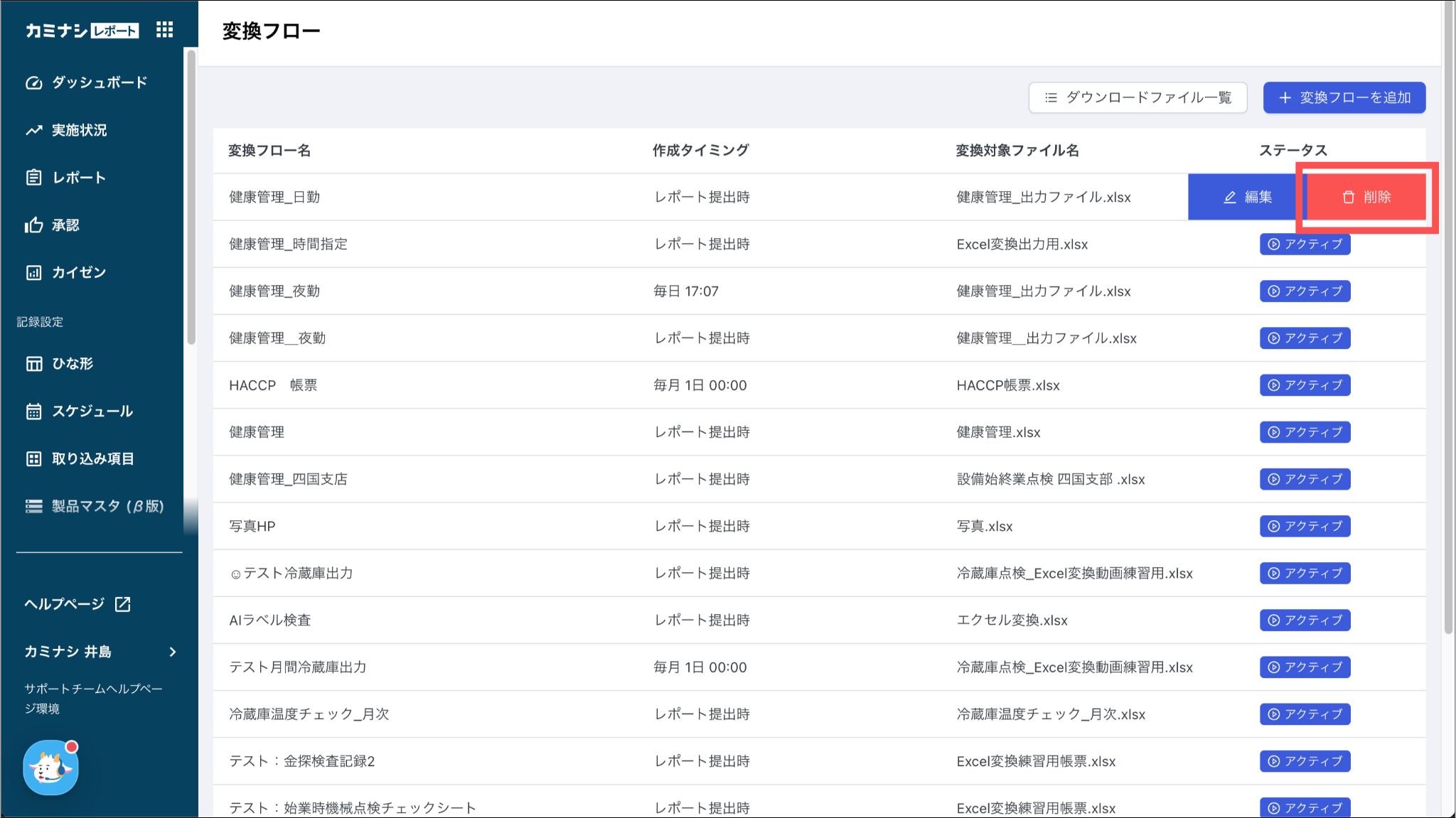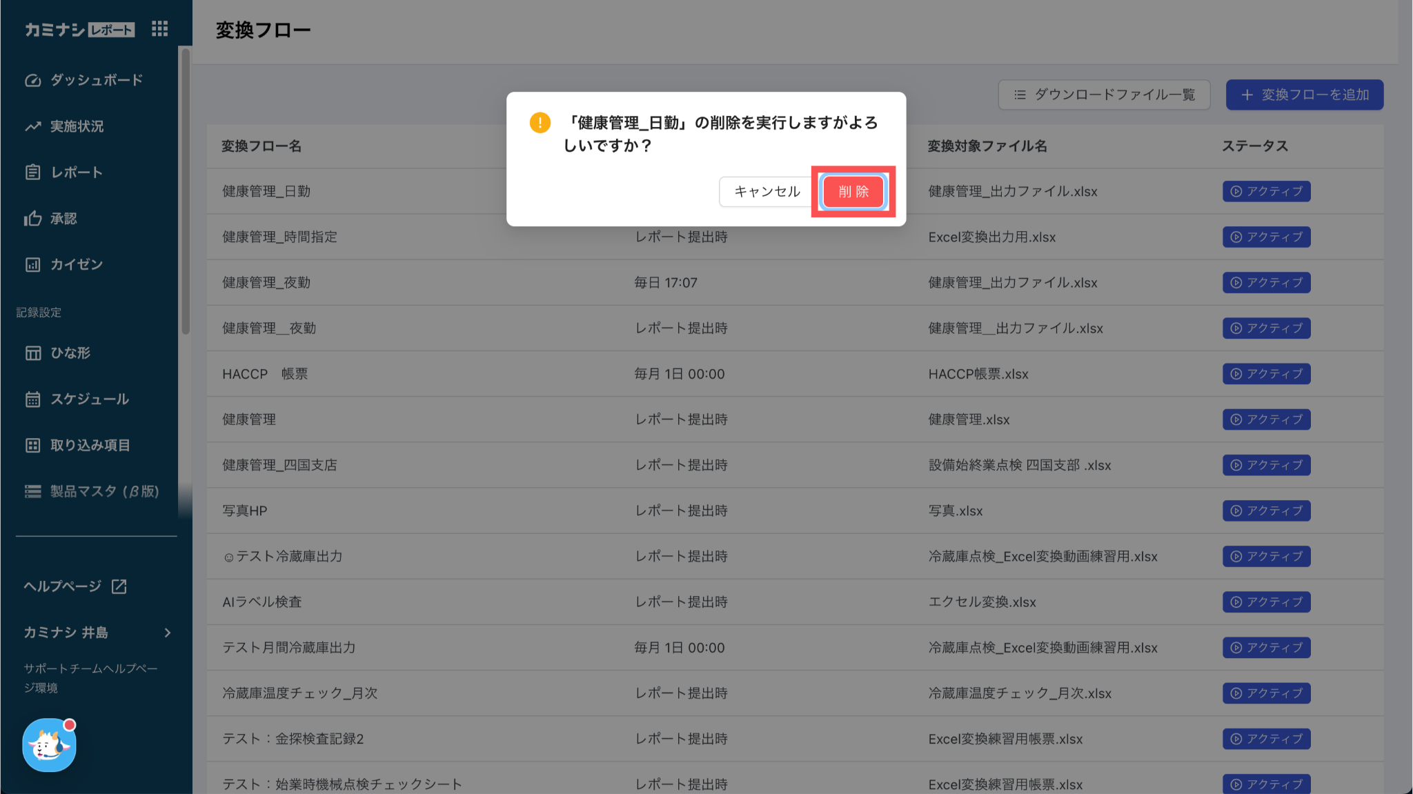 1. カミナシレポート 管理画面にログインする2.「Excel変換」を開き、削除する変換フローの「削除」を押す3.「削除」を押す一度削除されたExcel変換フローは復元できませんのでご注意ください。よくある質問は、こちらからご確認ください。