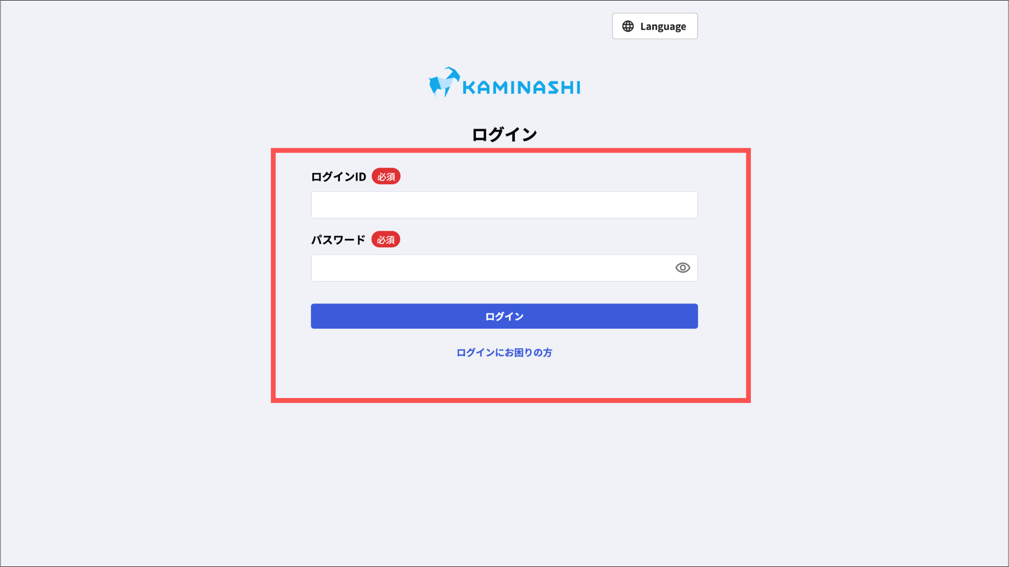 A.「https://id.kaminashi.com」からアクセスできます。カミナシID管理のカミナシアカウント管理者権限を持つユーザーのみがアクセスできます。※カミナシID管理とカミナシレポートは別サービスです。よって、カミナシID管理のカミナシアカウント管理者と、カミナシレポートの管理者は別の権限です。