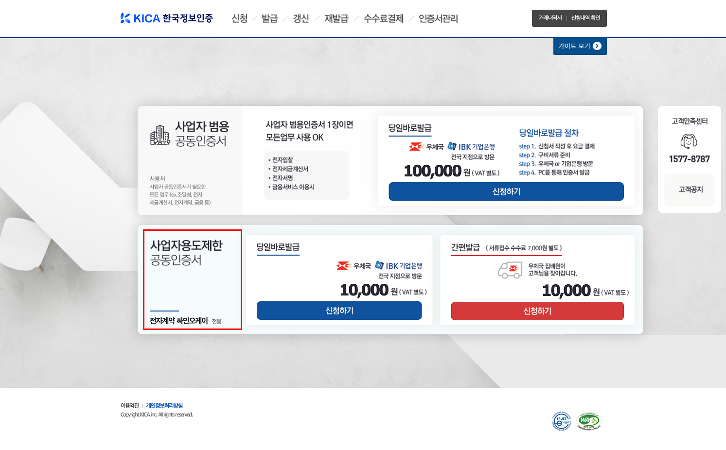 *아래와 같이 사업자용도제한 공동인증서(11,000원(VAT포함)) 신청하시면 됩니다.