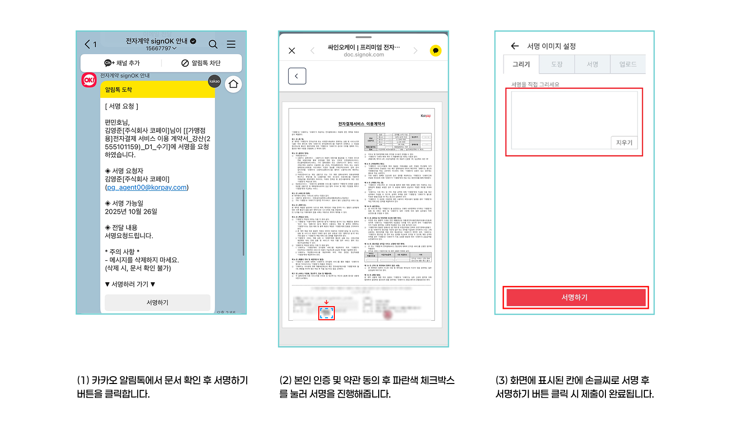 전자계약은 Sign OK 전자서명 시스템을 통해 진행되며, 이메일 주소로 발송됩니다.