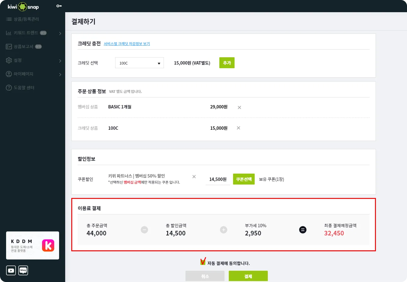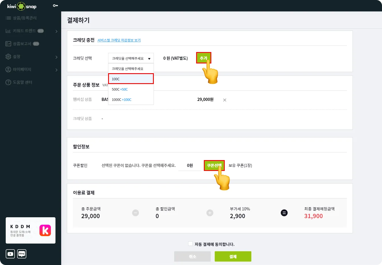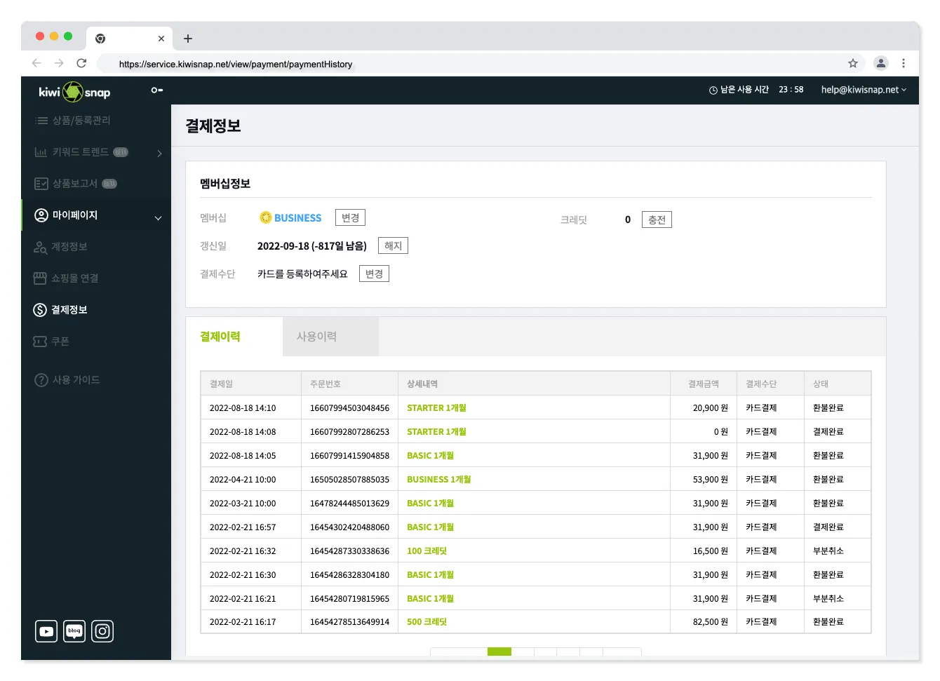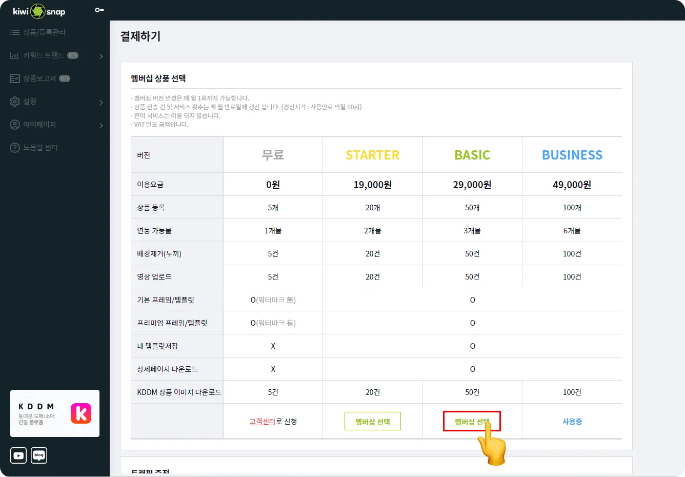 멤버십 월 정기결제 상품으로 등급별로 제공되는 상품등록 및 쇼핑몰 전송 채널 수가 다르니 상황에 맞춰 선택해 주세요. 멤버십 - 무료 - 결제없는 멤버십으로 전송할 쇼핑몰 1개, 상품등록 5개 이하 - STARTER - 전송할 쇼핑몰 2개, 상품등록 20개 이하 - BASIC - 전송할 쇼핑몰 3개, 상품등록 50개 이하 - BUSINESS - 전송할 쇼핑몰 6개, 상품등록 100개 이하 - ENTERPRISE - 전송할 쇼핑몰 6개, 상품등록 100개 이상은 키위 매니저에게 문의해 주세요! 크레딧 크레딧은 키위스냅의 재화로 충전후 멤버십에서 제공하는 상품등록, 이미지 배경제거, 동영상 업로드가 부족할때 사용이 가능합니다. 크레딧 차감 가이드 - 상품등록 : 10C - 영상 업로드 : 2C - 배경제거 : 1C