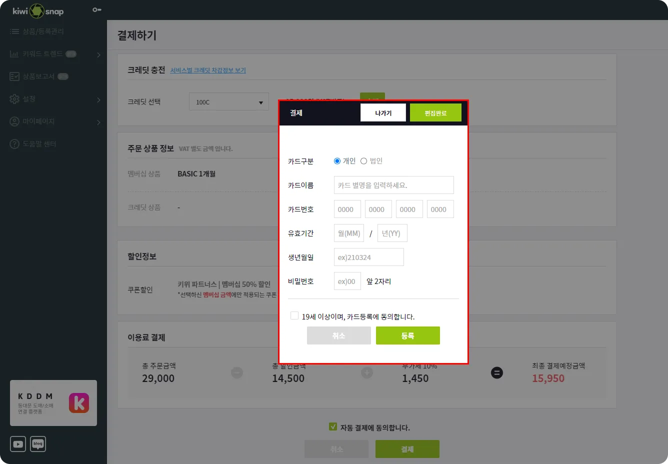 카드가 미등록 되어있다면 등록 팝업 보여지며 등록 후 결제 진행해 주세요.