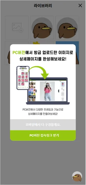 이제 디테일한 작업을 위해 PC로 이동하여 상세페이지, 쇼핑몰정보, 대표이미지 제작 및 편집을 진행해 주세요.