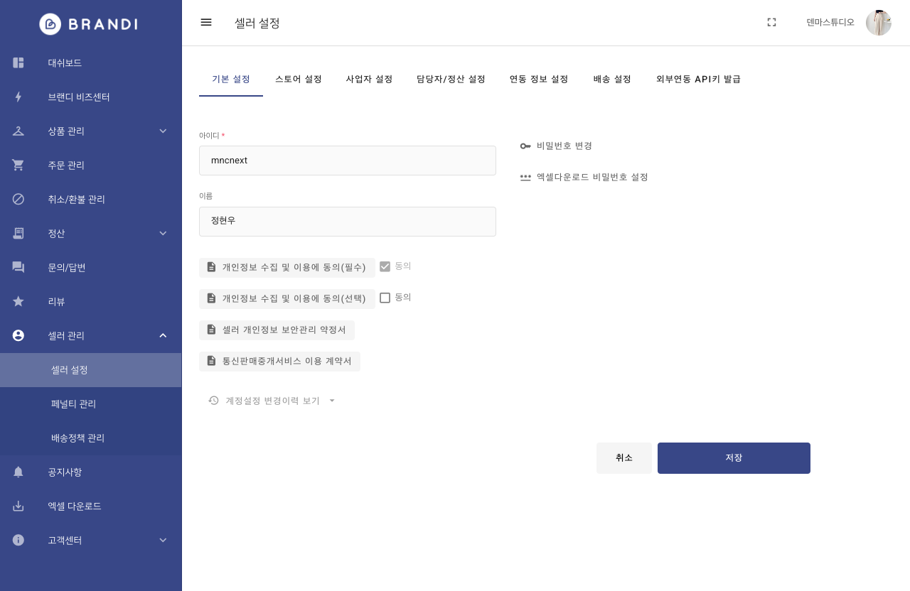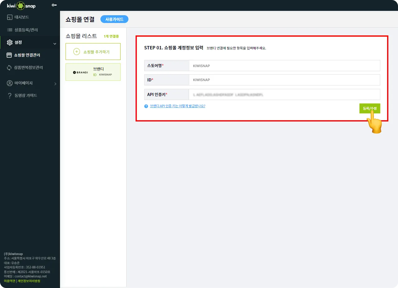 스토어명, ID, API브랜디의 스토어명, ID, API 인증키를 키위스냅에 입력 후 등록/수정 버튼을 클릭하시면 쇼핑몰 연동이 완료됩니다.