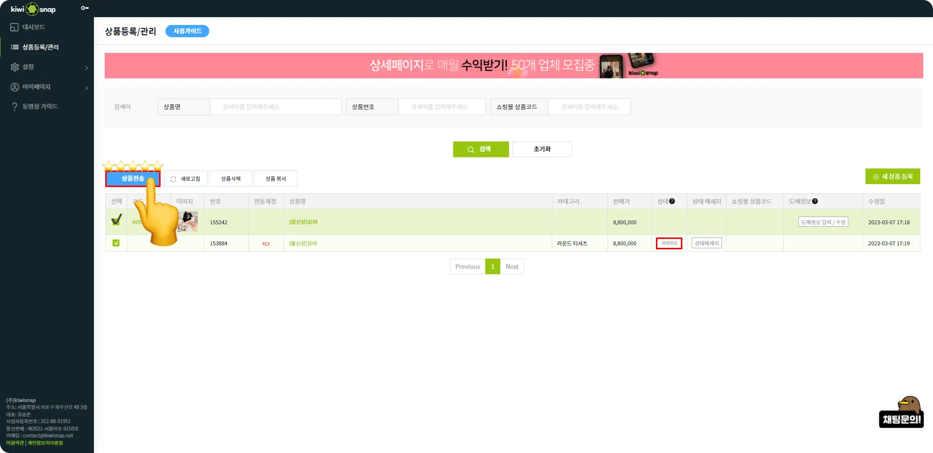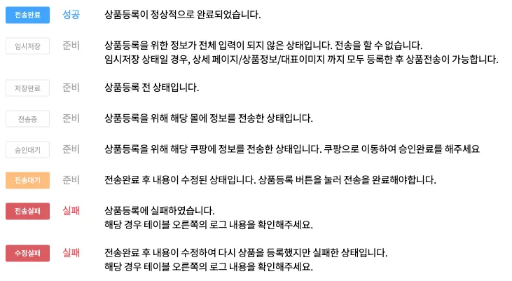 “저장완료”, ”전송대기”라면 각 쇼핑몰로 상품전송이 가능한 상태이며 체크후 상품전송을 눌러주세요.