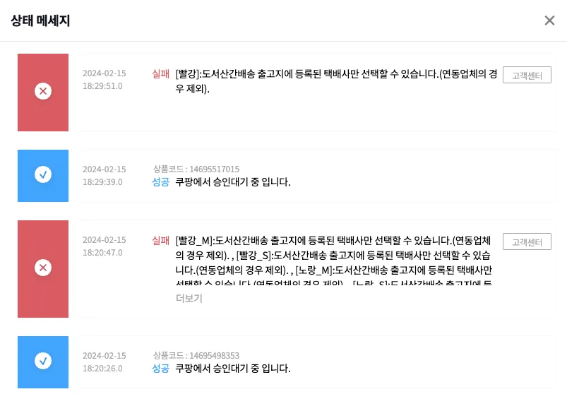 리스트에 있는 “실패메세지”버튼을 클릭하여 오류내용을 확인해 주세요.