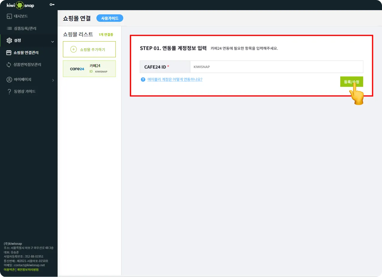 카페24 ID를 키위스냅에 입력 후 등록/수정 버튼을 클릭해 주세요.