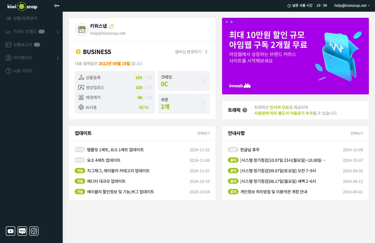 대시보드에서는 현재 멤버십 정보(상품 등록, 영상 업로드, 배경제거, AI 기능 등), 트래픽, 업데이트, 안내사항 등을 확인할 수 있습니다.