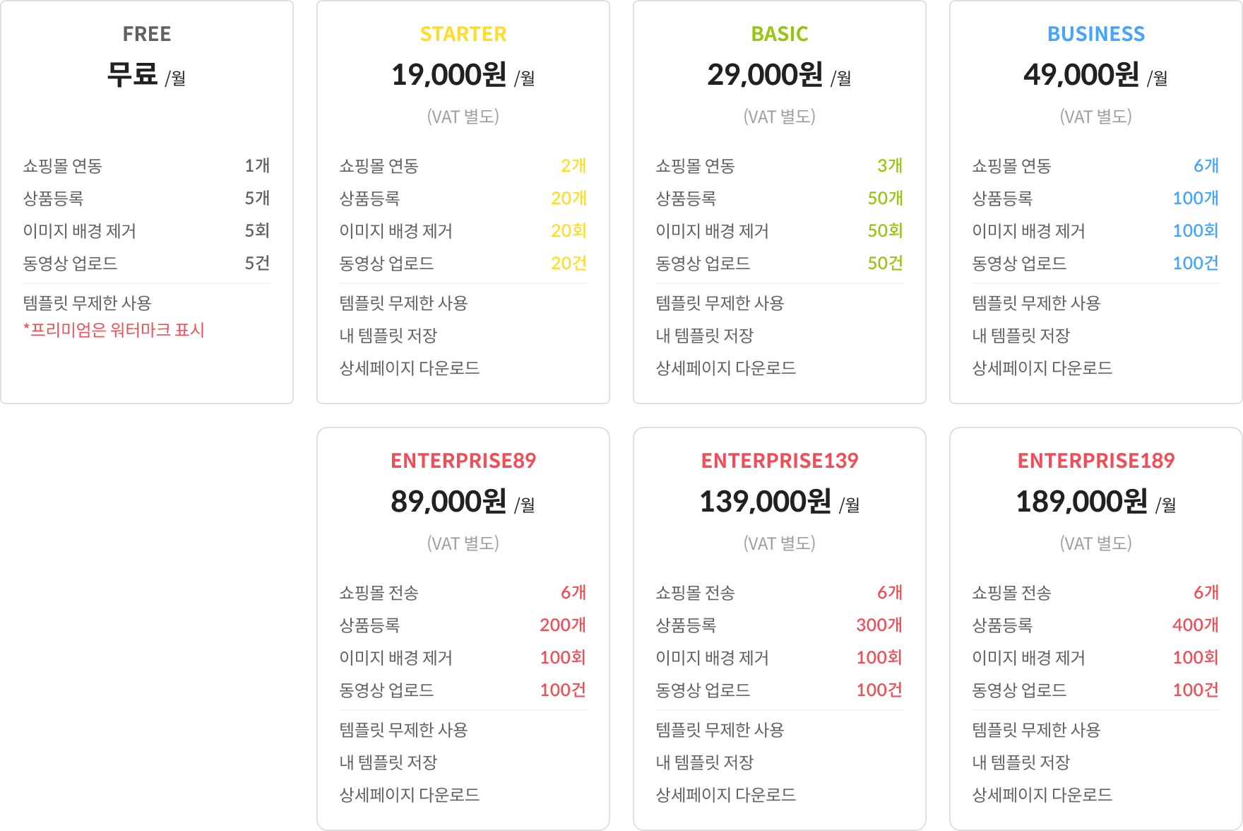 멤버십 월 정기결제 상품으로 등급별로 제공되는 상품등록 및 쇼핑몰 전송 채널 수가 다르니 상황에 맞춰 선택해 주세요. 멤버십 - 무료 - 결제없는 멤버십으로 전송할 쇼핑몰 1개, 상품등록 5개 이하 - STARTER - 전송할 쇼핑몰 2개, 상품등록 20개 이하 - BASIC - 전송할 쇼핑몰 3개, 상품등록 50개 이하 - BUSINESS - 전송할 쇼핑몰 6개, 상품등록 100개 이하 - ENTERPRISE - 전송할 쇼핑몰 6개, 상품등록 100개 이상은 키위 매니저에게 문의해 주세요! 크레딧 크레딧은 키위스냅의 재화로 충전후 멤버십에서 제공하는 상품등록, 이미지 배경제거, 동영상 업로드가 부족할때 사용이 가능합니다. 크레딧 차감 가이드 - 상품등록 : 10C - 영상 업로드 : 2C - 배경제거 : 1C