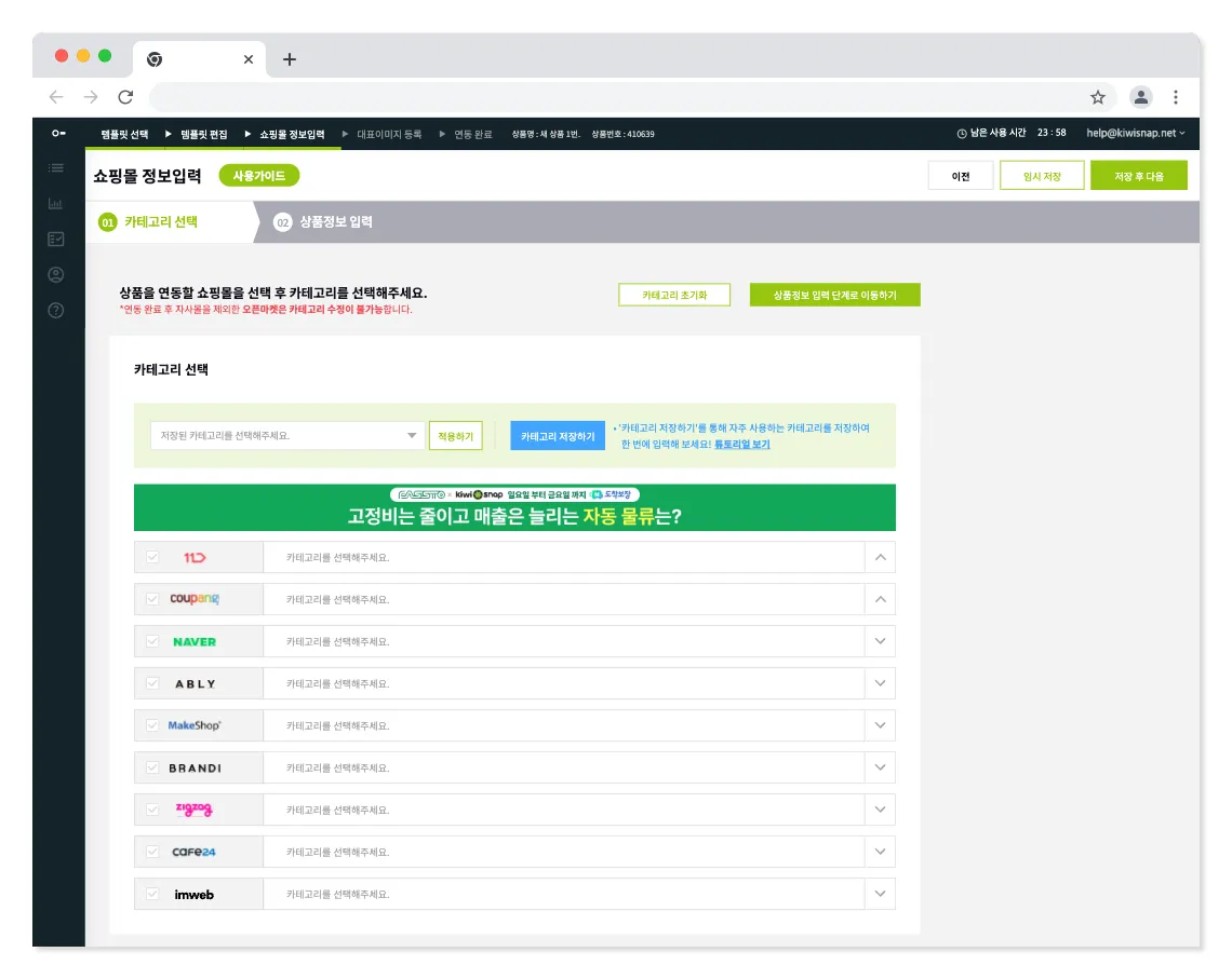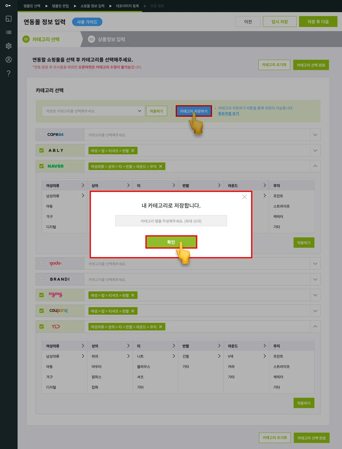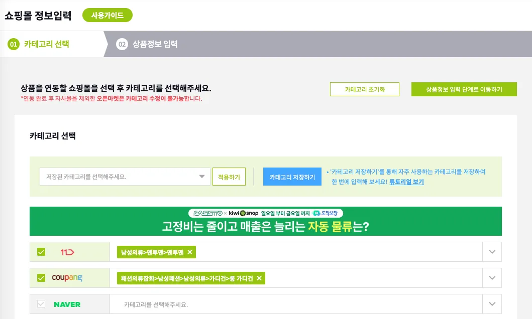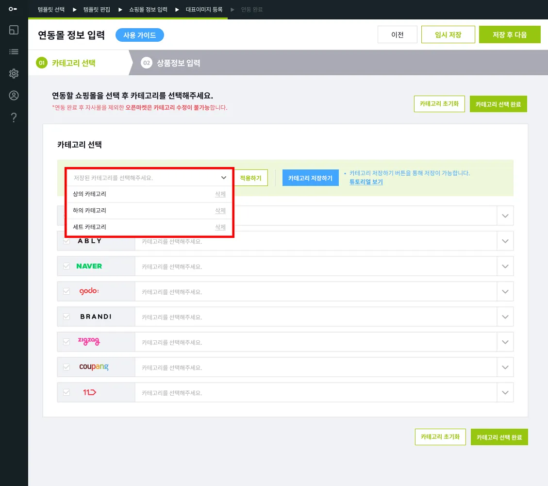 전송할 쇼핑몰의 카테고리를 선택해 주세요.