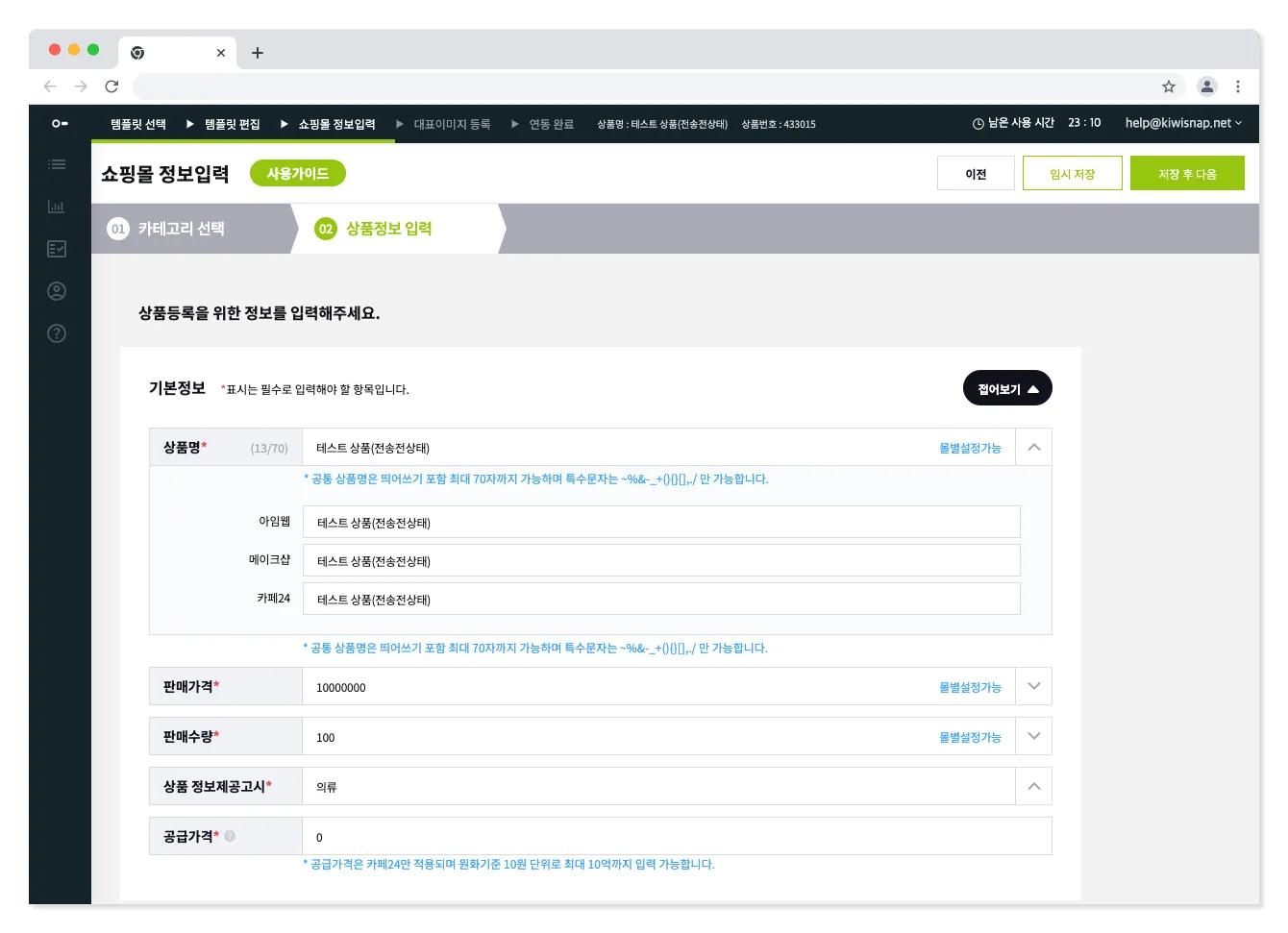 상품전송전까지는 공통으로 설정되며 전송이후에는 각 쇼핑몰별로 수정이 가능합니다.