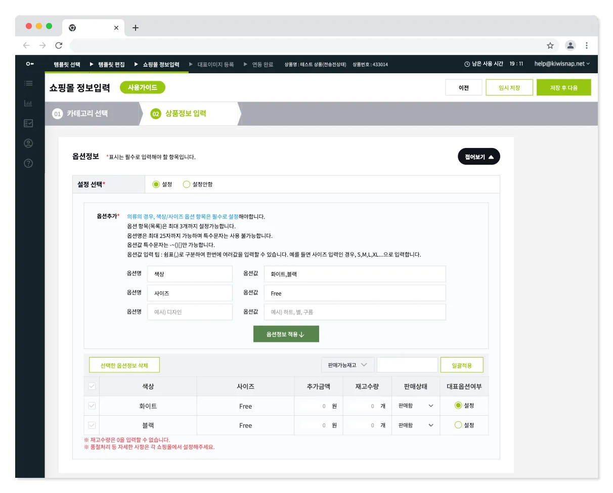 옵션정보는 상품의 옵션을 설정하는 영역입니다.
