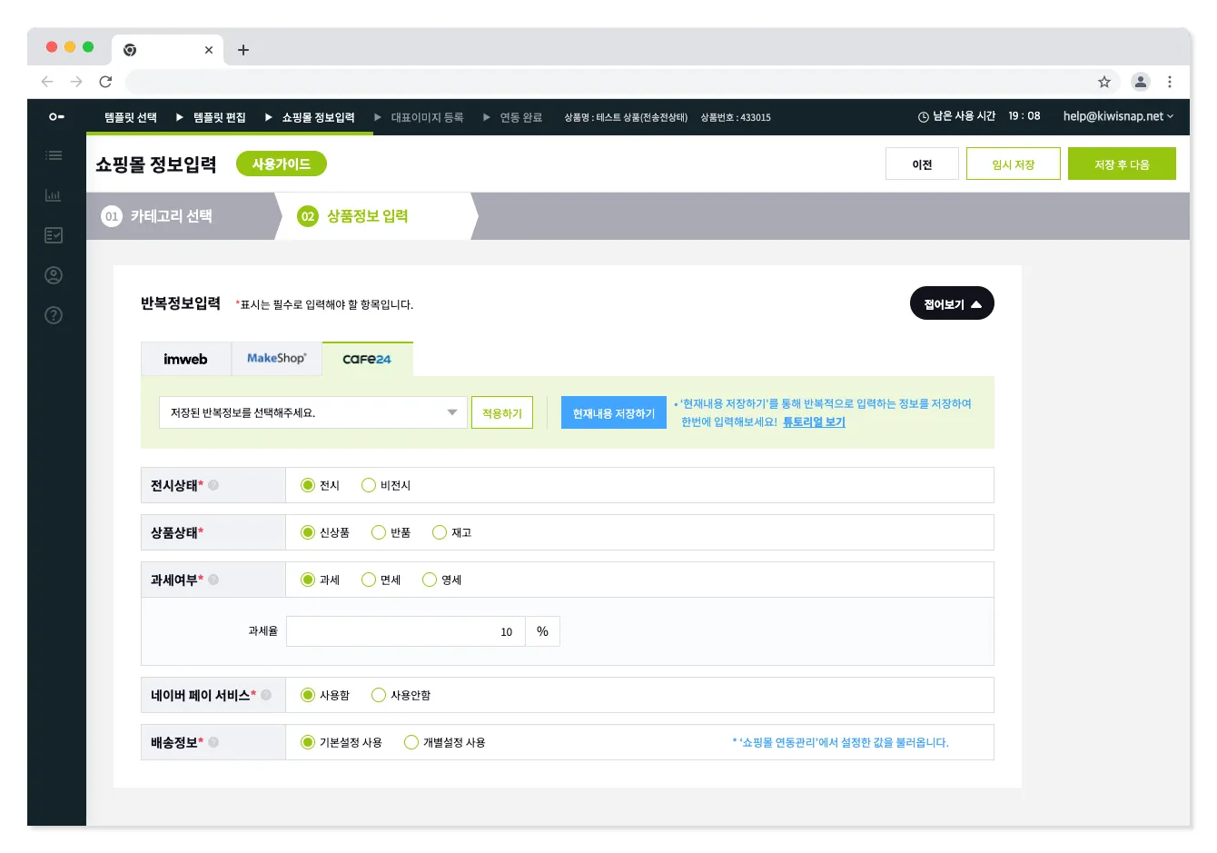반복정보는 과세 여부, 배송정보 등 쇼핑몰별 다른 설정값을 설정하는 영역입니다.