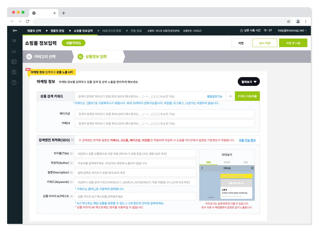 만약 쇼핑몰별로 다른 정보를 입력하고 싶다면 우측 화살표를 누르고 쇼핑몰별로 작성해 주세요.
