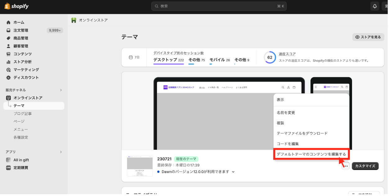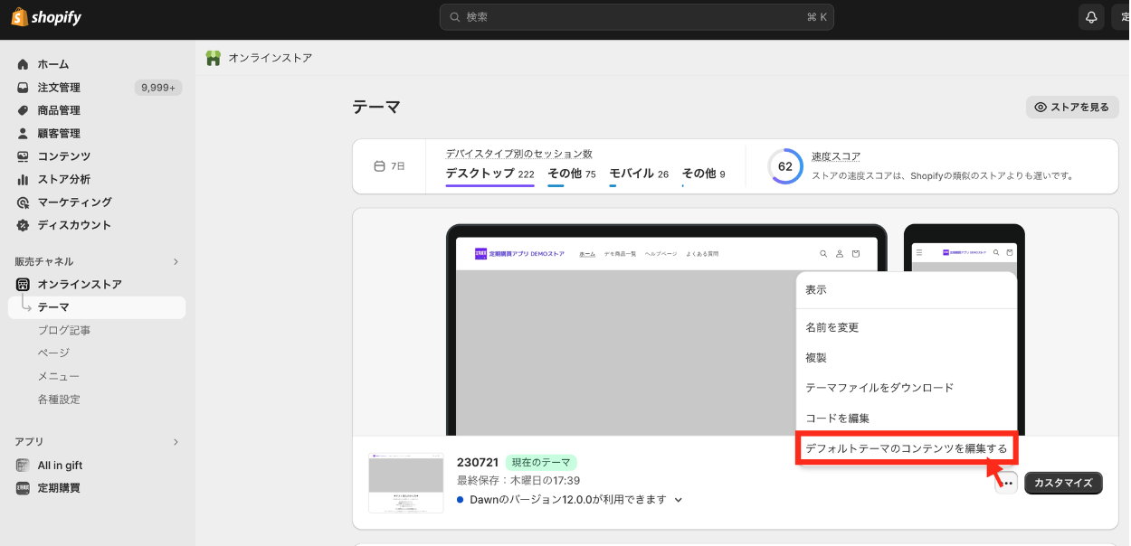 1-1. 販売チャネル>オンラインストア>テーマ>「・・・」>デフォルトテーマのコンテンツを編集する を開く