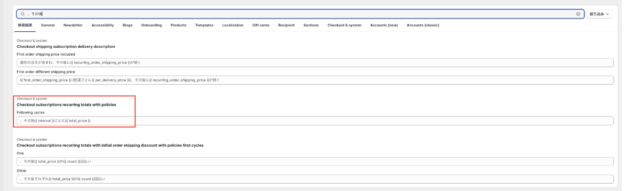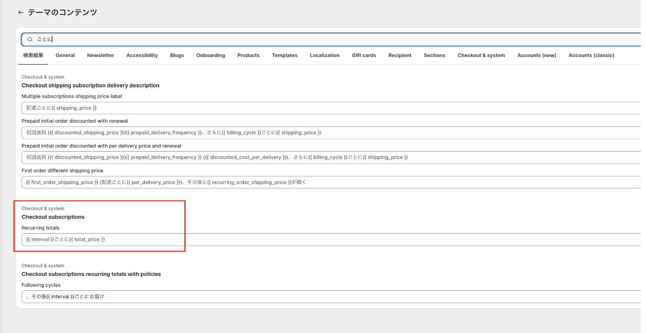 1-2. 「、その後{{ interval }}ごとに{{ total_price }}」を探し、「、その後{{ interval }}ごとにお届け」など、total_priceを含まない文言に変更