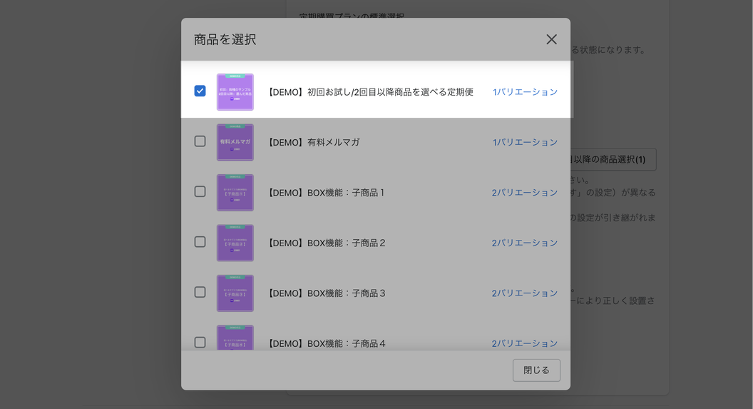 2回目以降に届ける商品を選択し「閉じる」をクリック