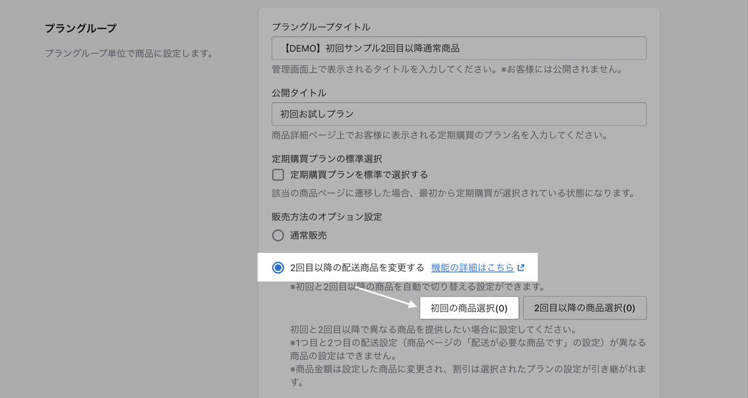 「2回目以降の配送商品を変更する」オプションが設定されていないプラングループを選択してください。
