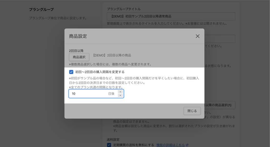 「初回〜2回目の購入間隔を変更する」にチェックを入れ、初回購入日から2回目の決済日までの日数を入力