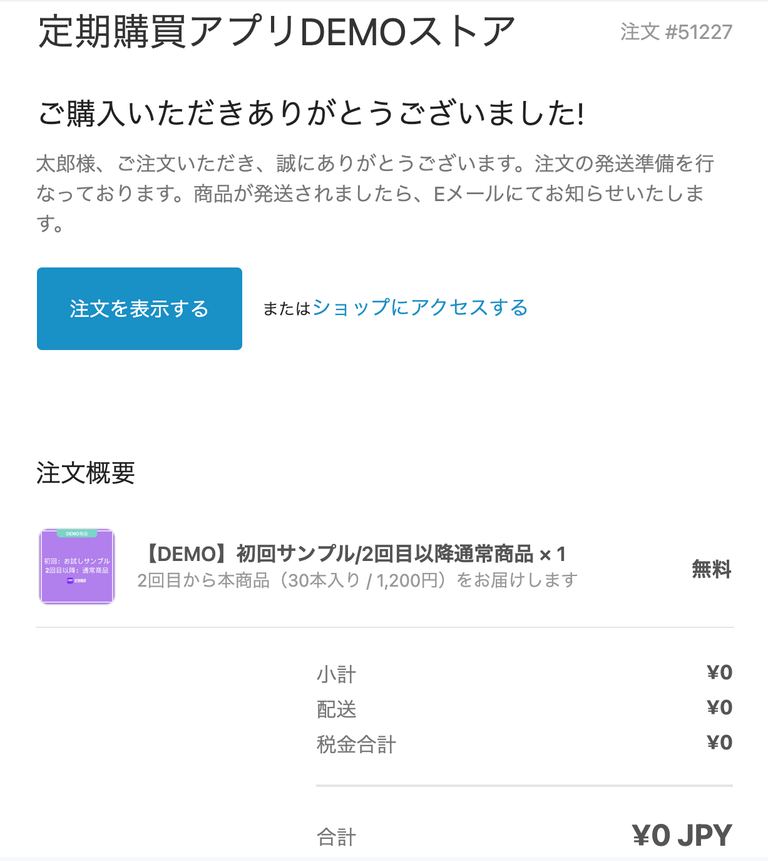 2回目以降の注文では、通知の「注文概要」に2回目以降購入用の商品が表示されるようになります。