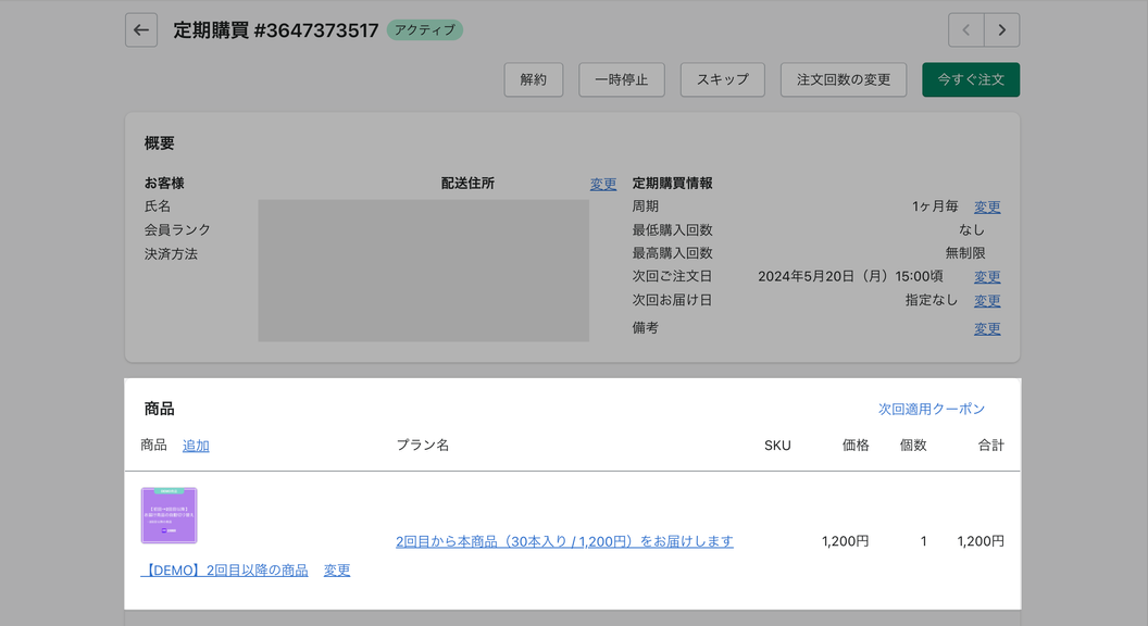 本機能は配送設定が同じ商品に限り利用可能です。 そのため、「初回商品:配送なし」「2回目以降の商品:配送あり」という設定は実現できませんのでご了承ください。