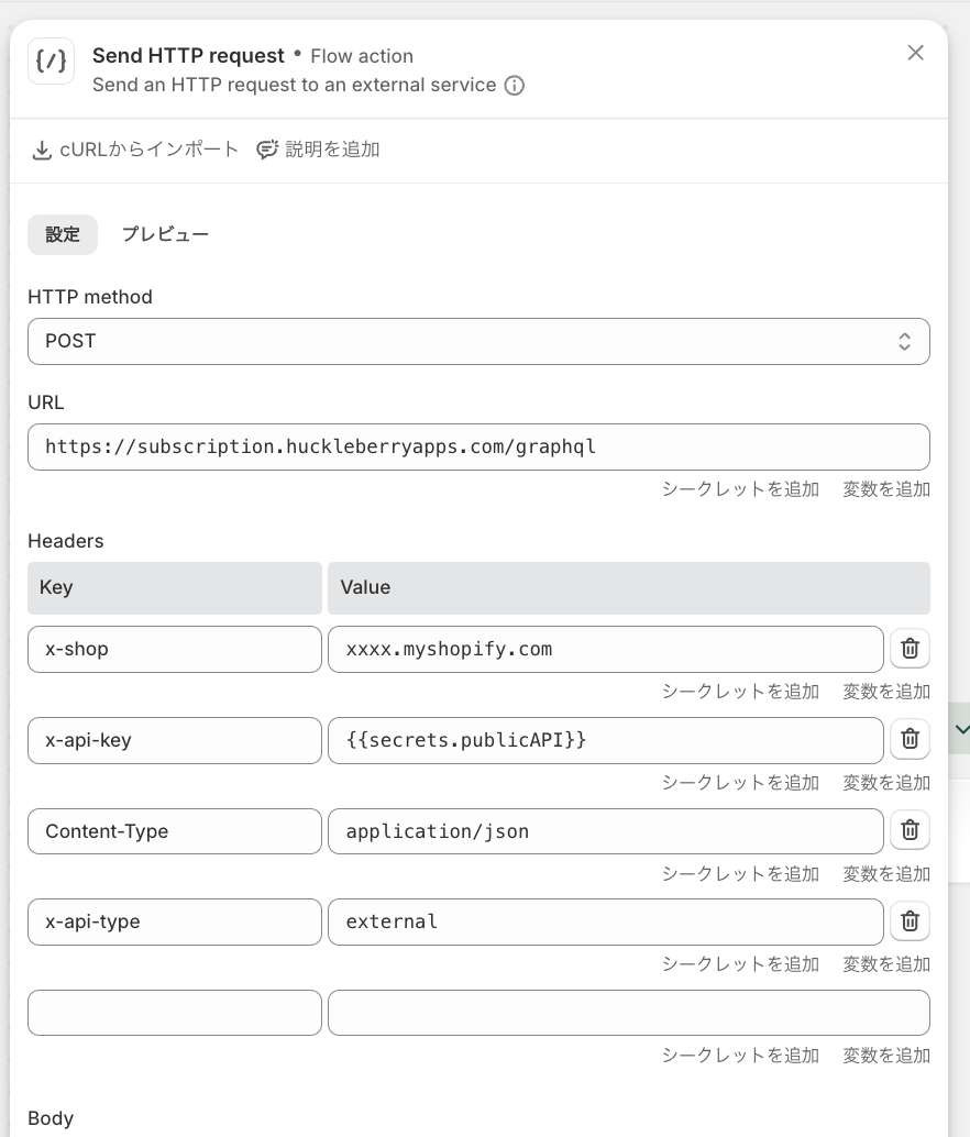 ※ShopifyFlowでHTTPリクエストアクションを利用する必要があるため