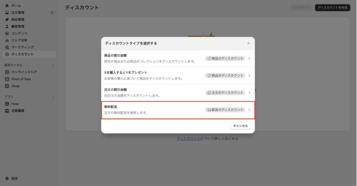 Shopify管理画面で「ディスカウントを作成」から「無料配送」を選択